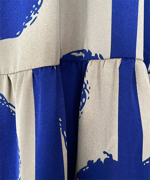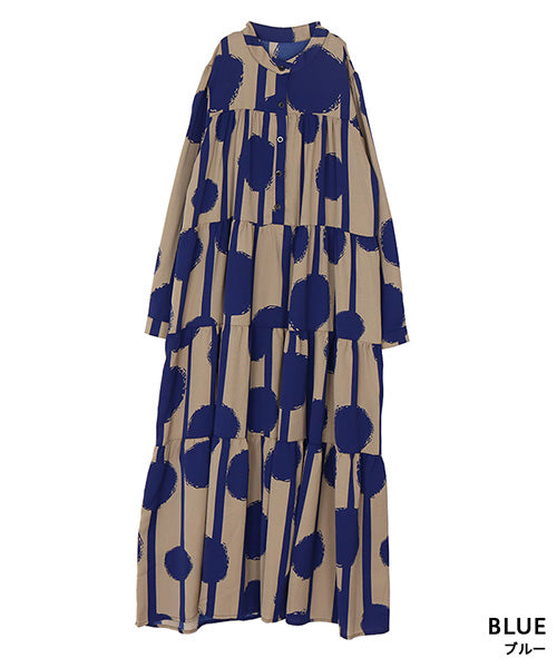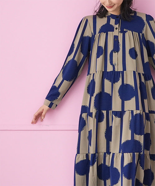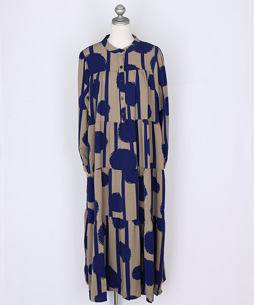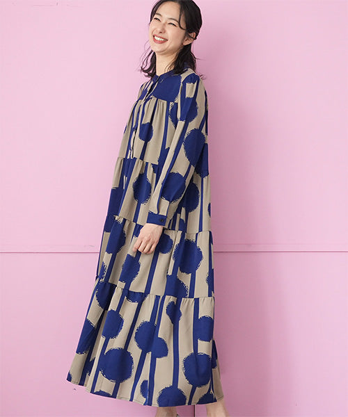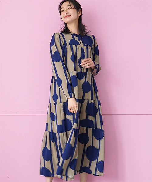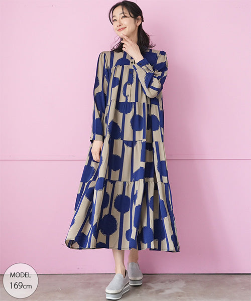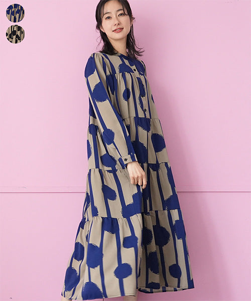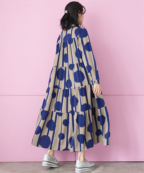 大胆なドット×ストライプ柄が目を惹くワンピース。 ギャザーが入ったティアードデザインが大人可愛い印象をプラスしてくれます。 たっぷり広がるAラインシルエットが気になるボディラインをカバー。 1枚でコーディネートが完成するおすすめアイテムです。
