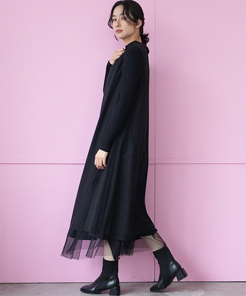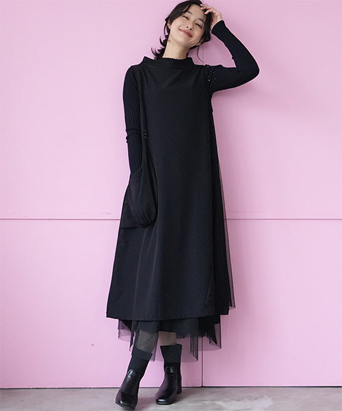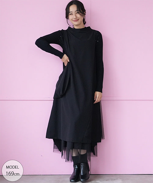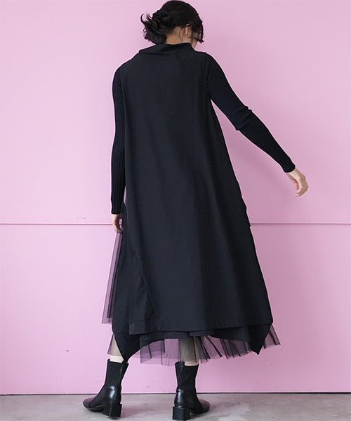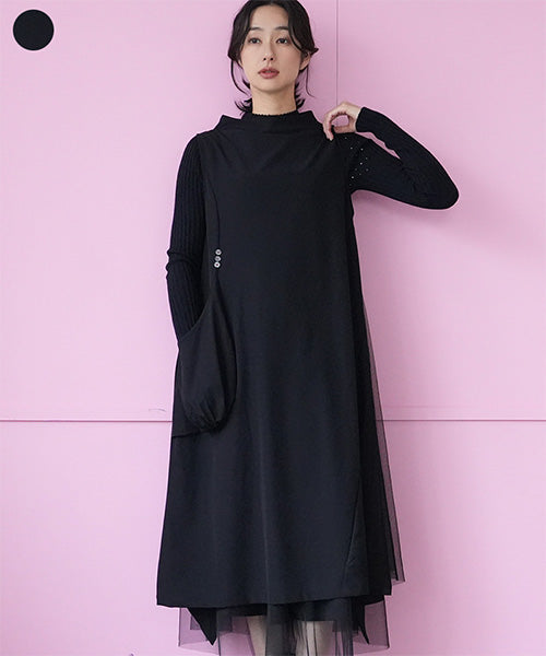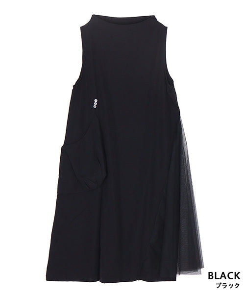 モードな印象を放つアシンメトリーデザインのノースリーブワンピース。 片側には繊細なチュールを重ね、もう一方には立体的なドレープポケットを配置。 異素材のコントラストがスタイリングに奥行きを与え、洗練された雰囲気を演出します。 さりげない光沢のボタンディテールがアクセントになり、1枚で主役になるデザイン性の高いアイテムです。