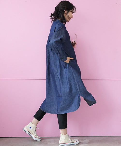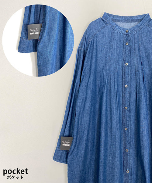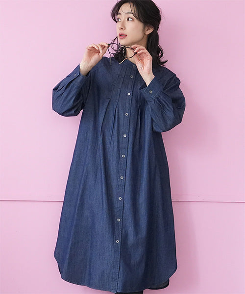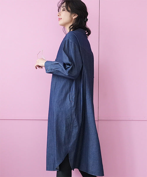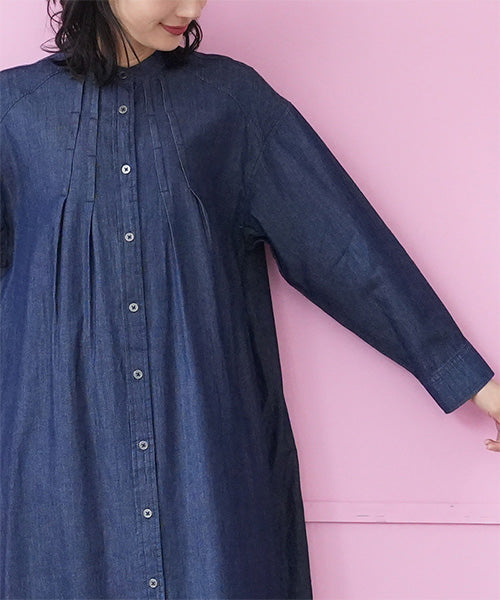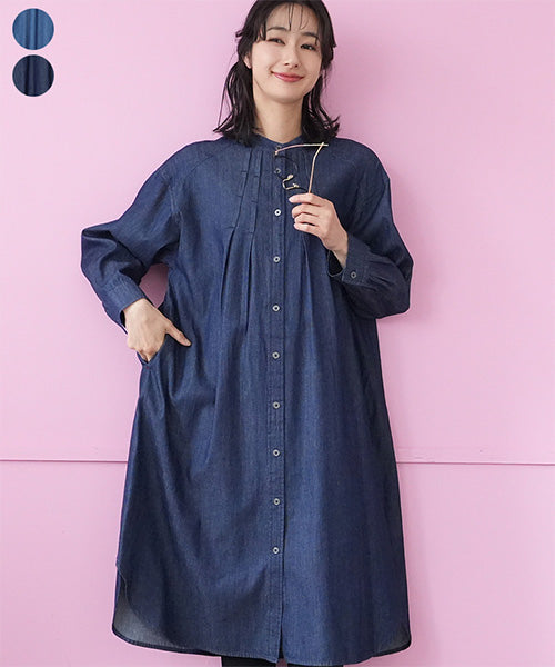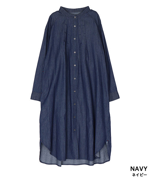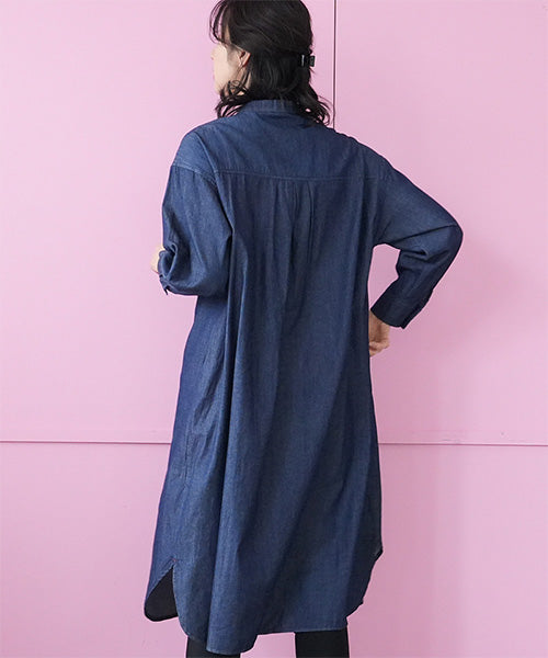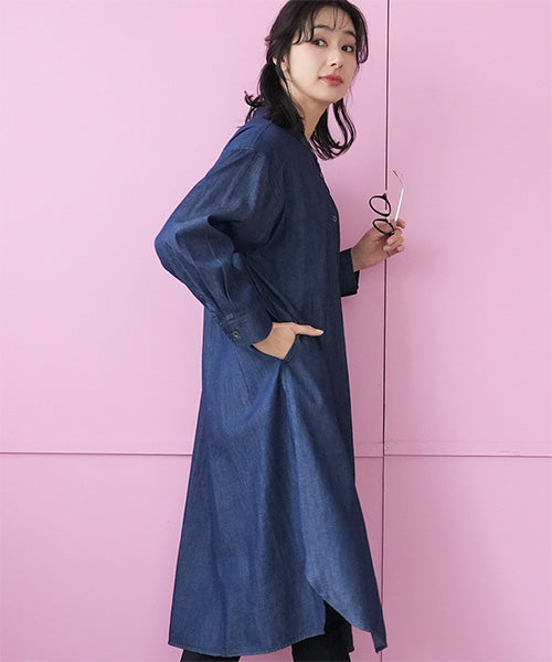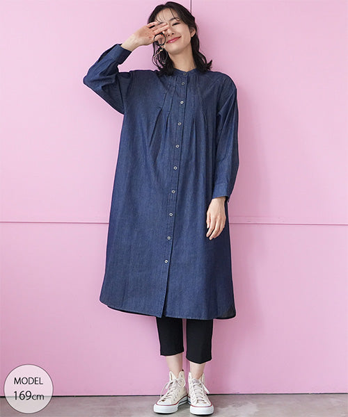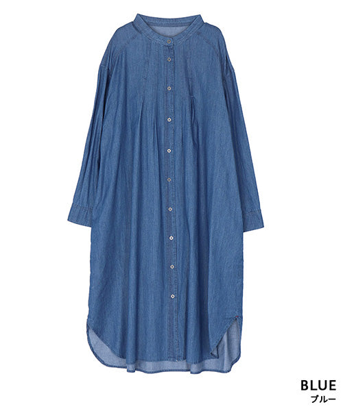 綿100%バンドカラータック切替ロングシャツワンピース 33-0532