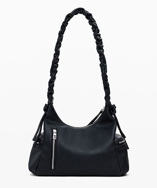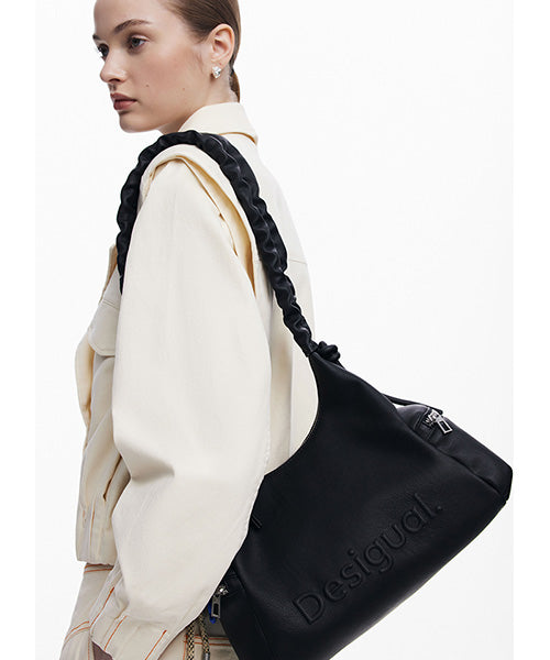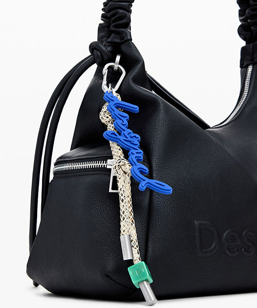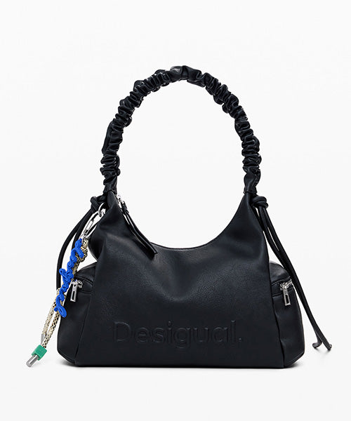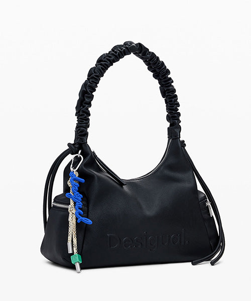 無地のレザー風生地の中型ハンドバッグ。 3D効果のロゴ、ギャザー付き調節可能なハンドル、取り外し可能なキーチェーンのディテールとなっています。