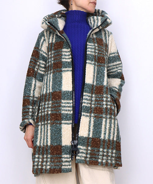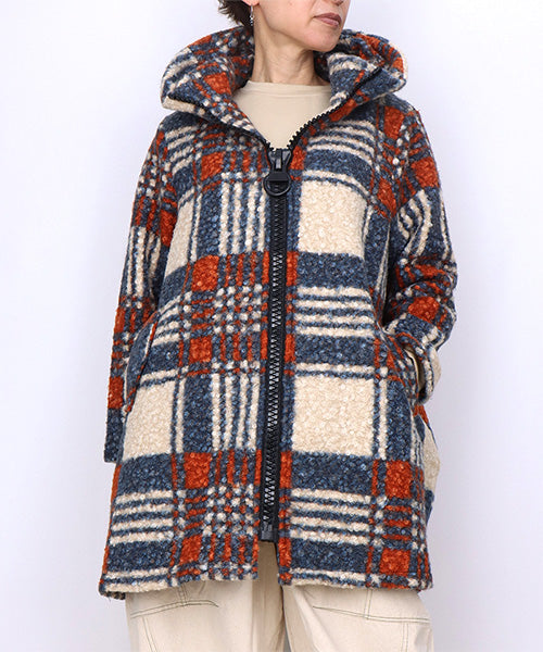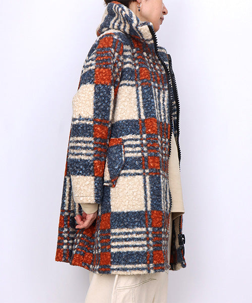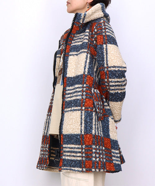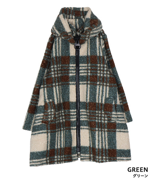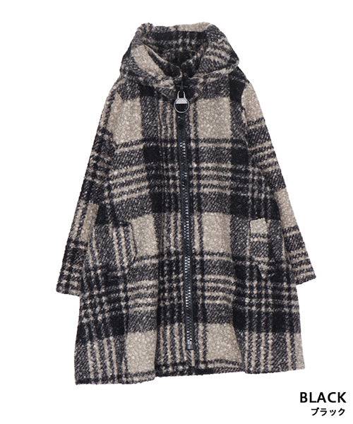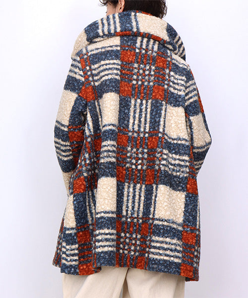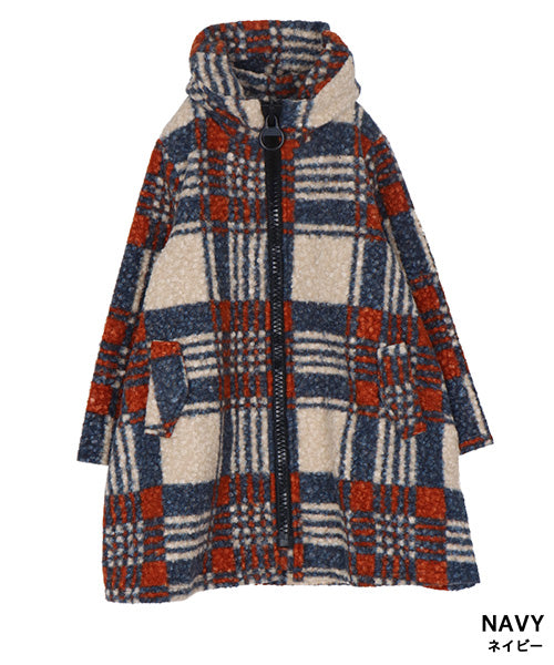 大胆なチェック柄が目を惹くコートです。 モコモコとした肌触りのブークレ生地で暖かく快適に着用いただけます。 裾に向かって広がるAラインシルエットがボディラインをカバーしながら女性らしさをプラス。 デイリーに着まわしたいシーズンライクなアイテムです。