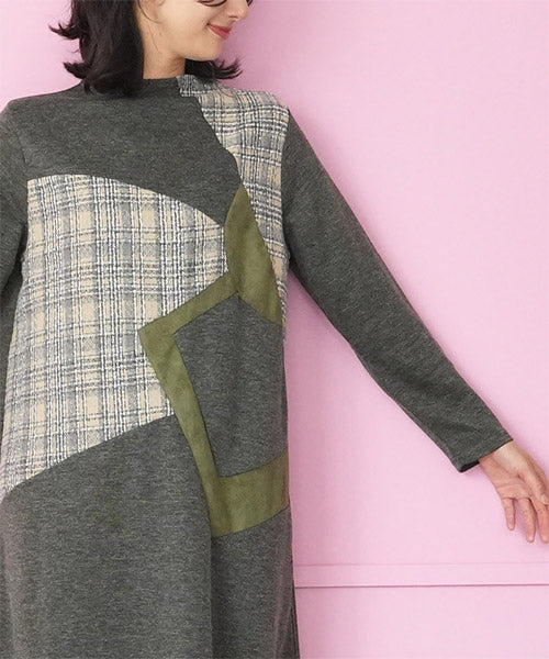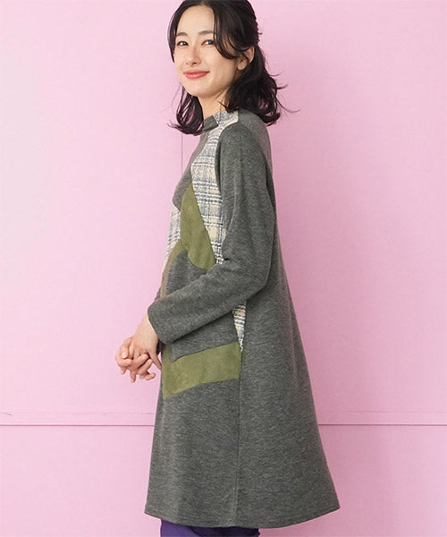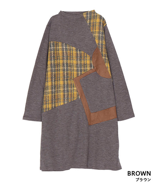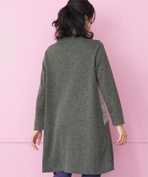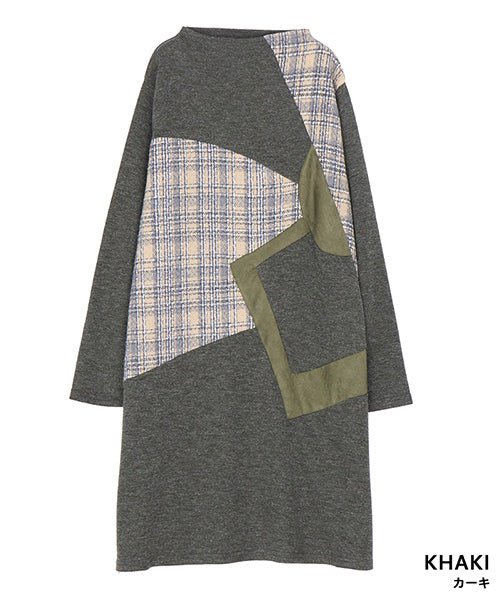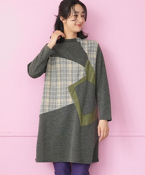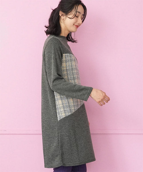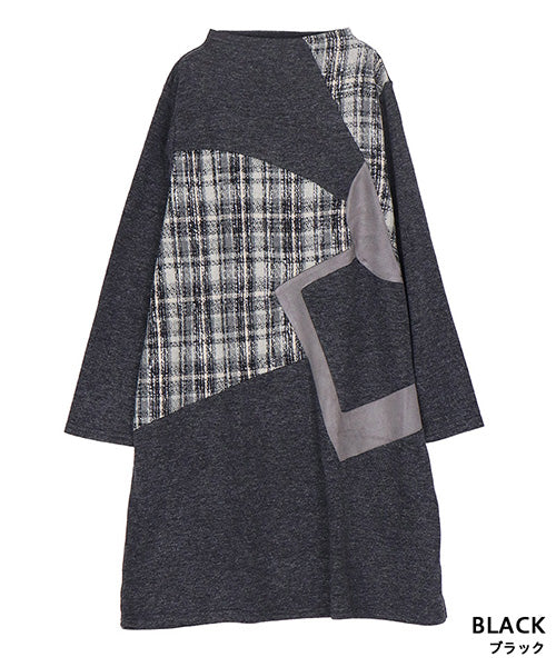 ツイードパッチワーク切替長袖チュニック 46-0273