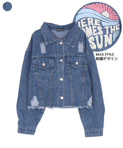 バック刺繍ショート丈ダメージデニムジャケット 06-2902
