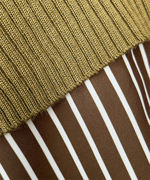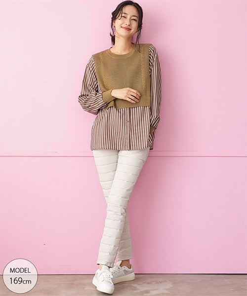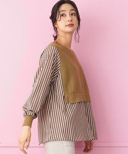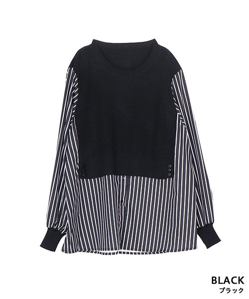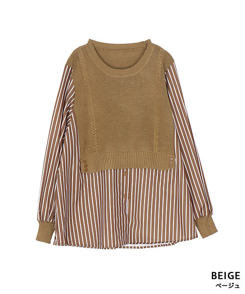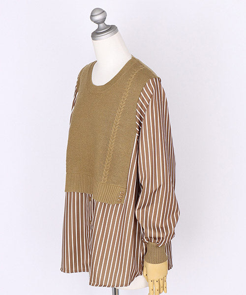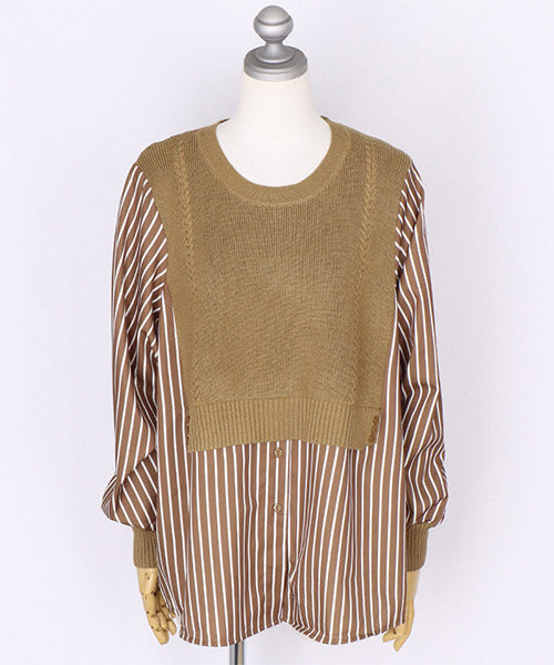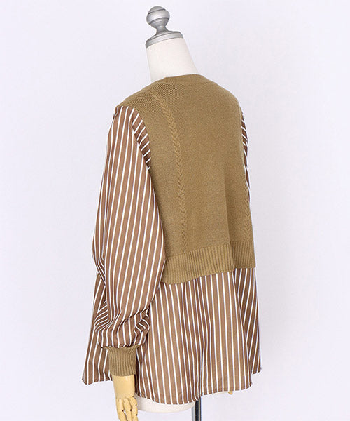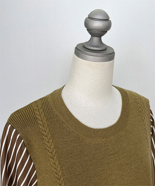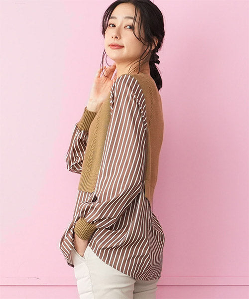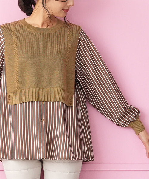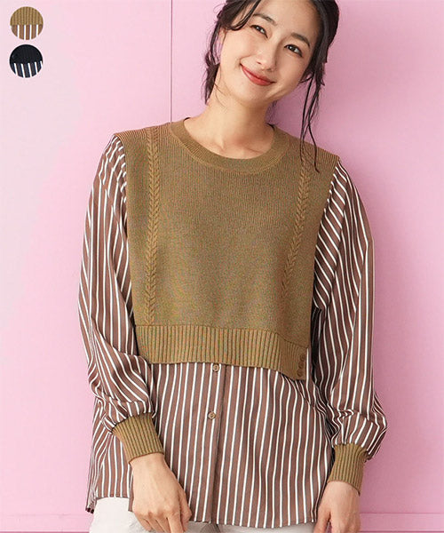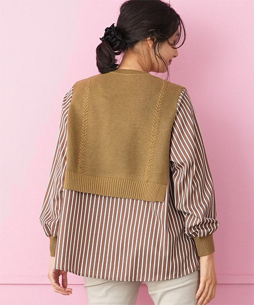 1枚でレイヤード風コーデが完成する、ニットベストとストライプシャツを組み合わせたドッキングブラウス。 前身頃のケーブル編みニットが程よい立体感を演出し、シャツ部分は縦ストライプ柄でスッキリとした印象に。 裾に向かって広がるシルエットが体型を自然にカバーし、パンツにもスカートにも合わせやすい1枚です。 カジュアルからきれいめまで、幅広いスタイリングに活躍します。