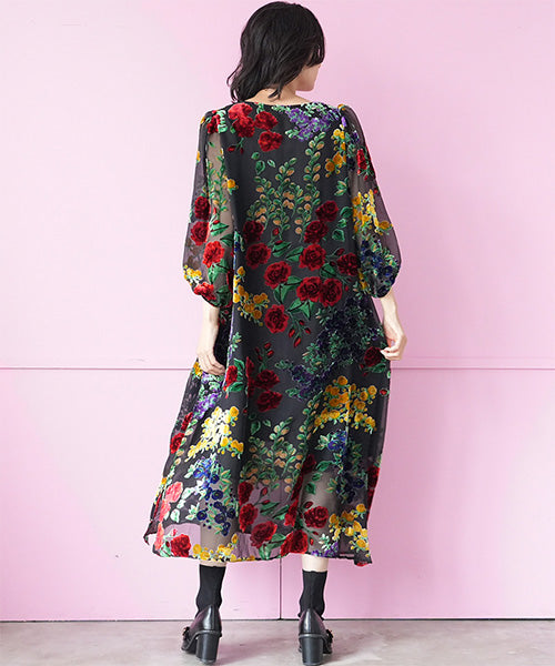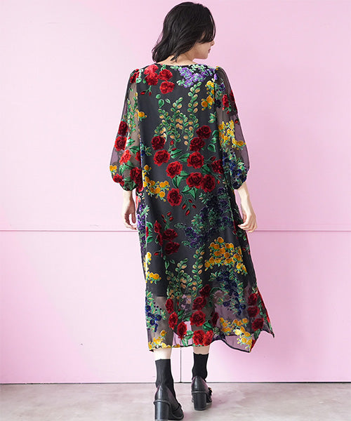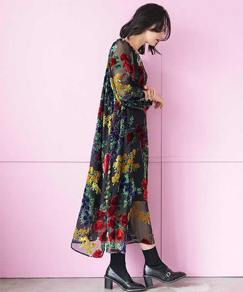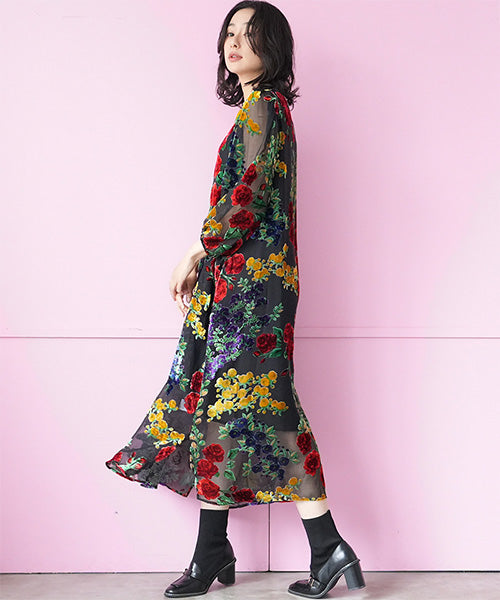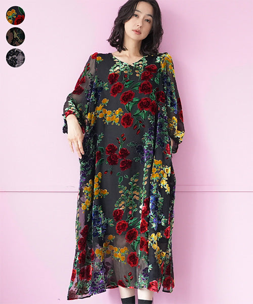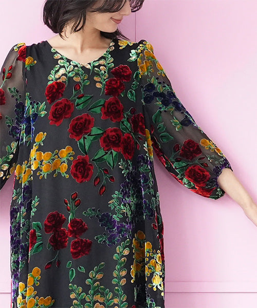 艶やかなベルベット調の柄使いが映えるロングワンピース。