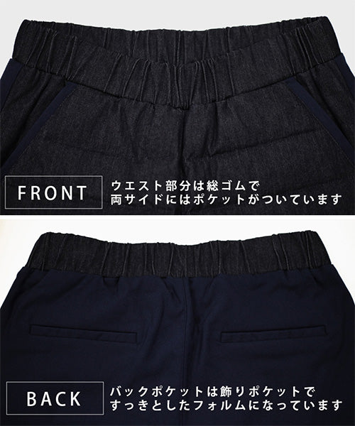 若々しいデニム生地との切り替えで、カジュアル感たっぷりの軽快パンツです。