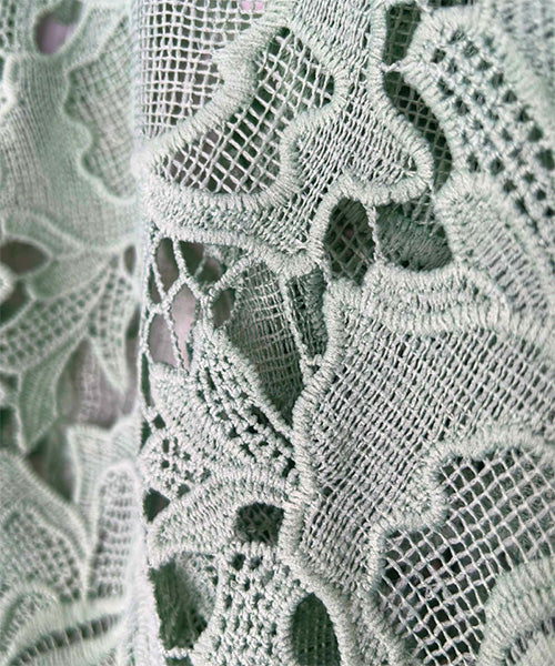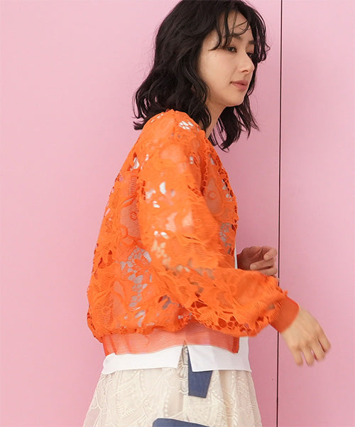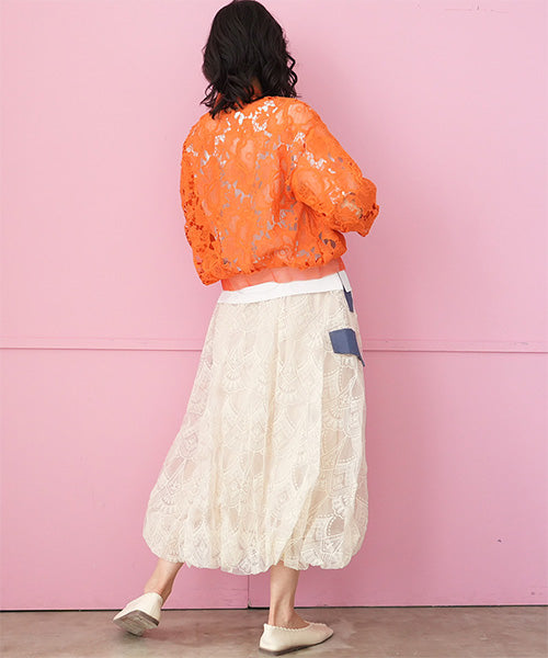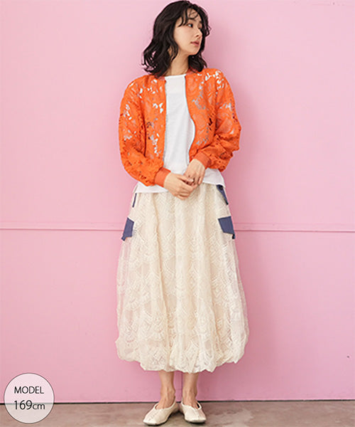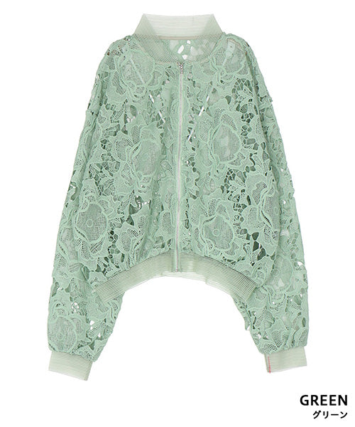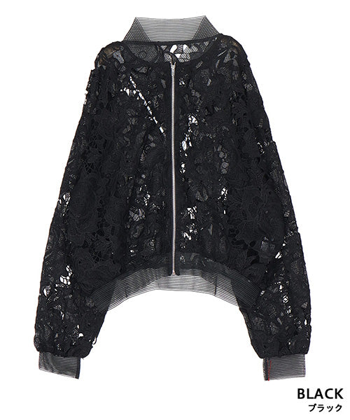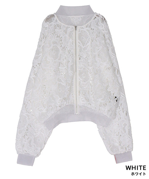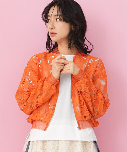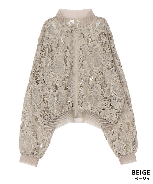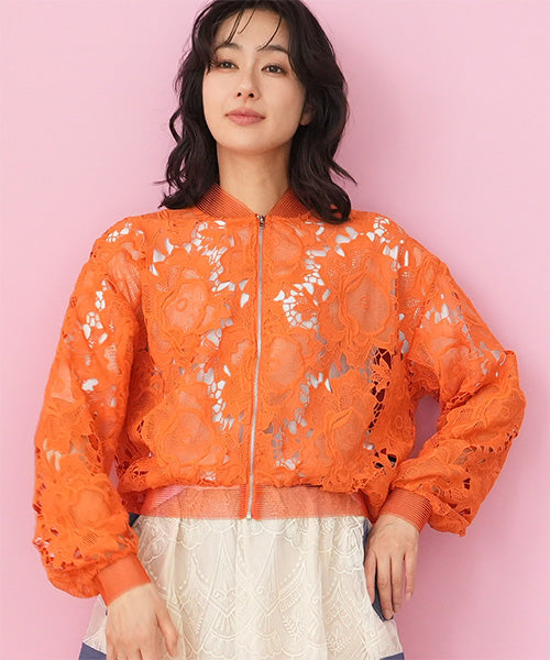 総レース刺繍が華やかなブルゾンジャケット。 衿元・袖口・裾とゴムテープを施し、前開きファスナーで脱ぎ着しやすい仕様となっています。 レース刺?の透け感が装いを軽やかに演出し、羽織るだけで特別感が溢れます。 さまざまなインナーとの組み合わせがコーディネートの幅を広げ、いつものファッションを格上げしてくれます。