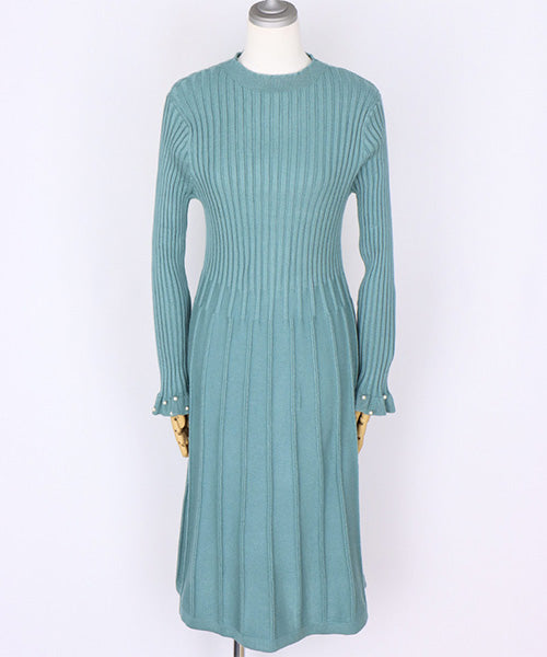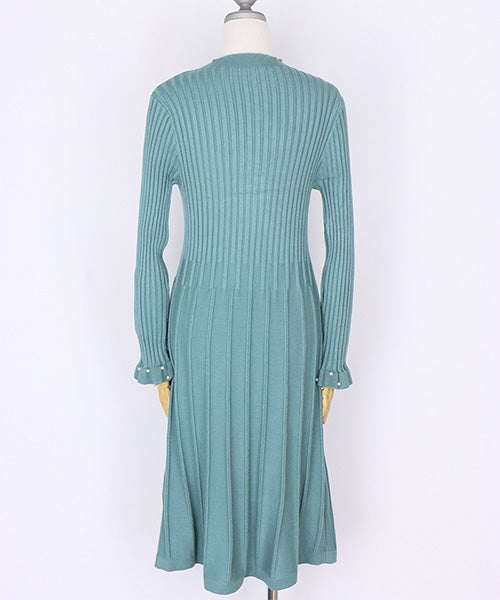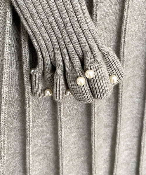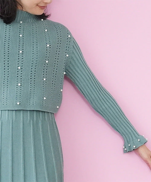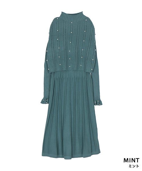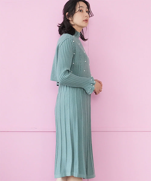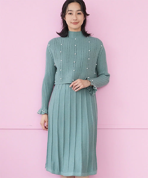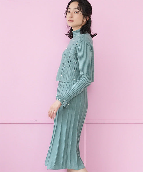 ベストとワンピースがセットになったニットアンサンブル。 パールが散りばめられていてフェミニンな印象を与えてくれます。 ベストはガーリーな透かし編みとバランスを取りやすいショート丈。 ワンピースは裾に向かって幅広になるリブデザインでタテのラインを強調してくれるのがポイント。 ベストとワンピースをそれぞれ単品使いするのもおすすめな使い勝手抜群のアイテムです。