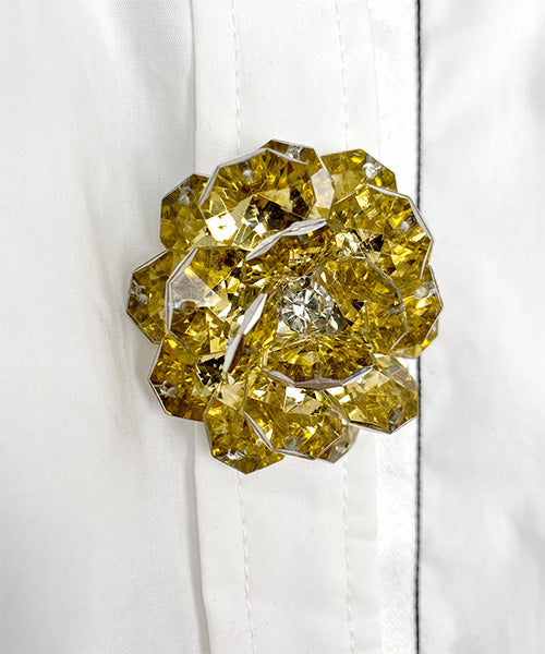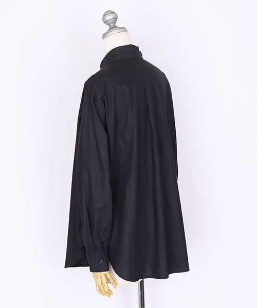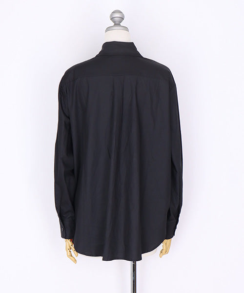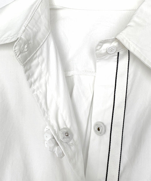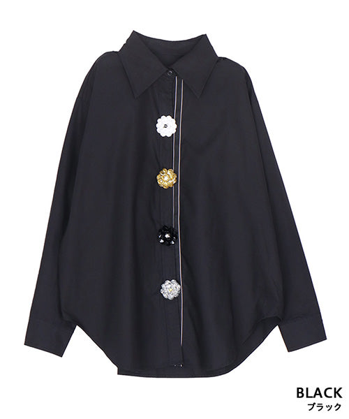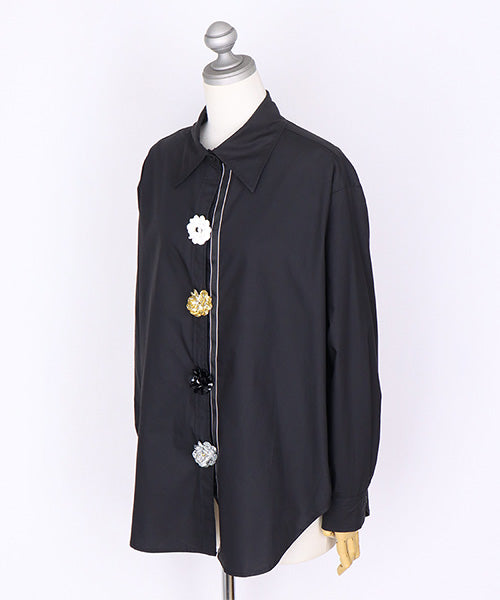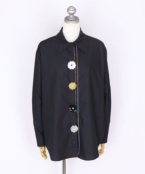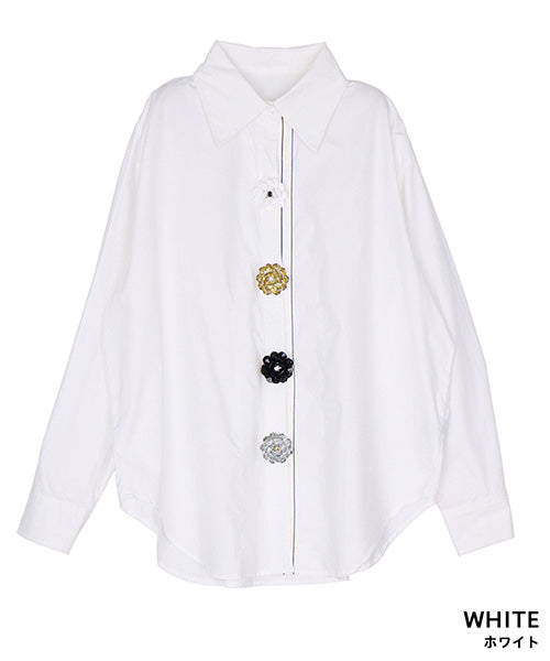大きなフラワーモチーフボタンが可愛いシャツブラウスです。 前立てのテープ使いがアクセントになっています。 ゆったりとオーバーシルエットで体型カバーを叶え、羽織りとしても活躍するアイテムです。