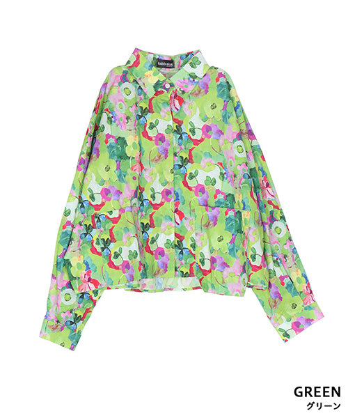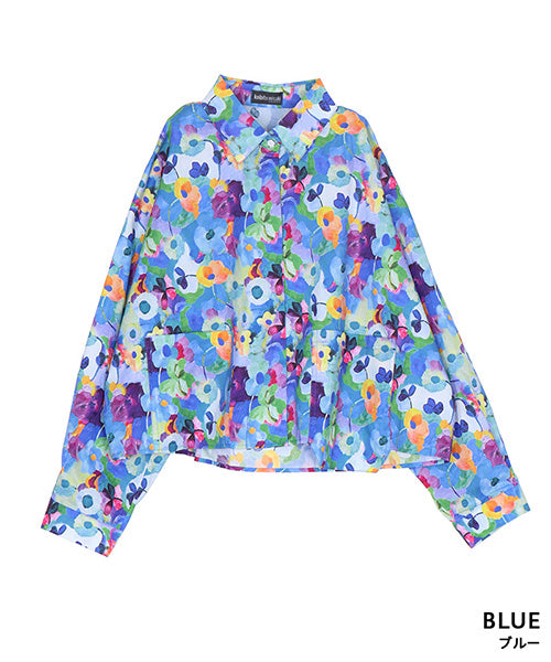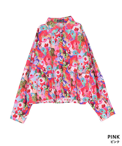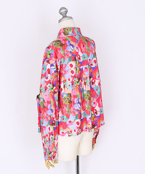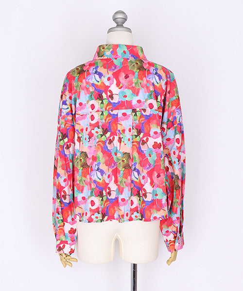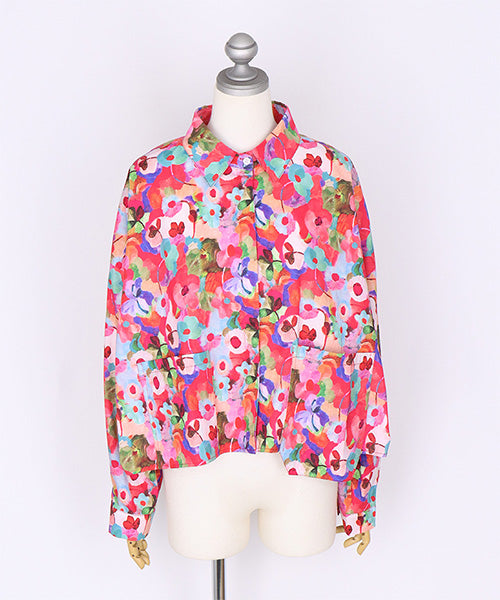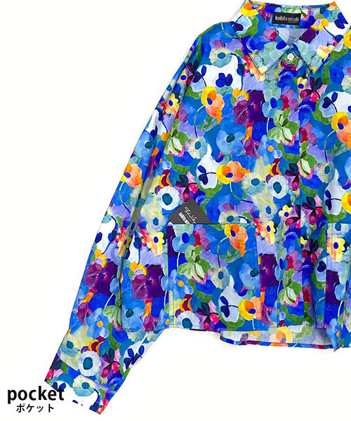 鮮やかなフラワープリントが目を惹く、存在感抜群のシャツブラウス。ブ 多彩なカラーがミックスされ、華やかで遊び心のあるデザインに仕上がっています。 ゆったりとしたシルエットとフロントの大きめポケットが、カジュアルな抜け感を演出。 1枚で主役になるアイテムとして、デニムや無地のボトムスとの相性も抜群です。