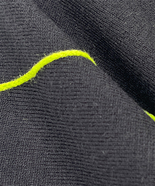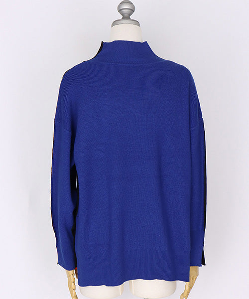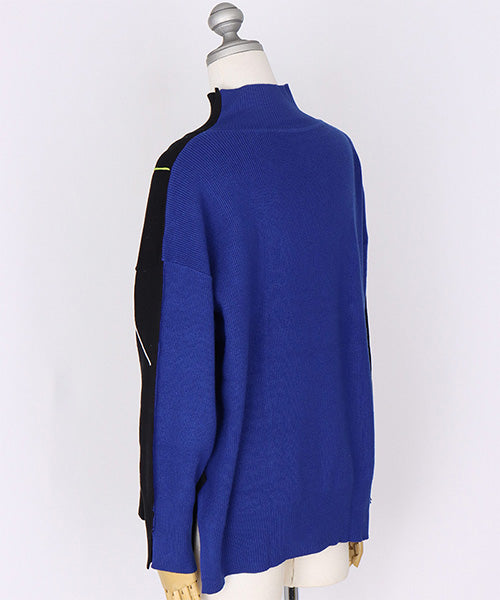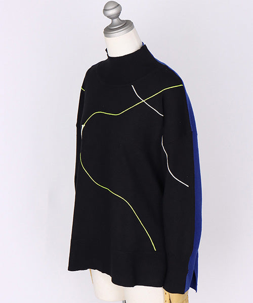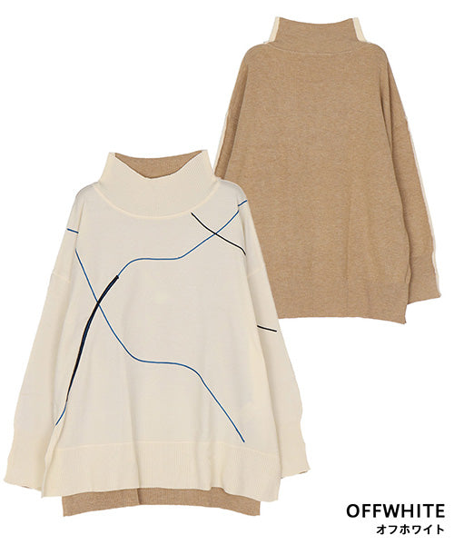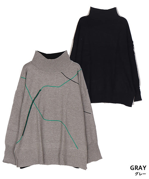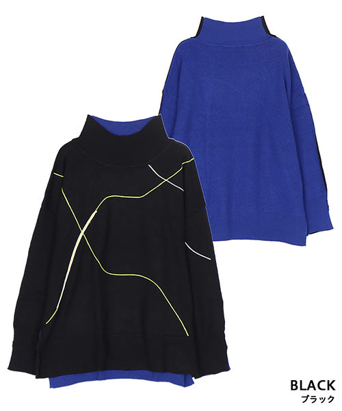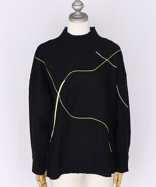 フロントはアートなライン刺繍、バックはシックな無地で切り替えた、洗練ムード漂うハイネックニット。