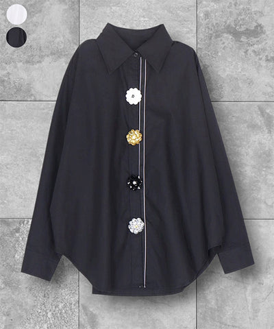 綿100%フラワーモチーフボタン長袖ワイドシャツブラウス 06-2957