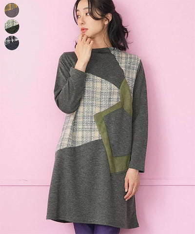 ツイードパッチワーク切替長袖チュニック 46-0273