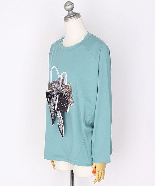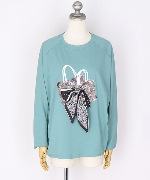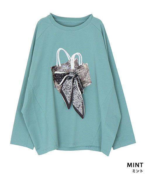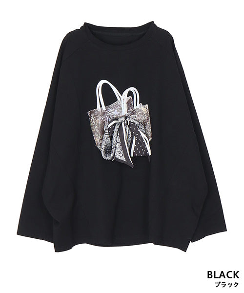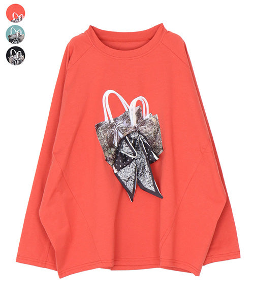 バッグのプリントに、可愛らしいリボンモチーフがついたTシャツタイプのカットソーです。 ドルマンスリーブや脇に切り替えを施すことにより、ラクなのにシンプルなモード感を演出しています。 カジュアルなTシャツでありながら遊び心のあるデザイン。 柔らかな日差しに映えるキレイな色目も魅力です。