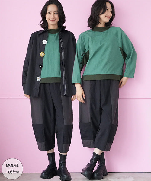 異素材切替袖英字プリント長袖ワイドカットソー 36-1754