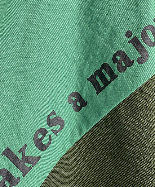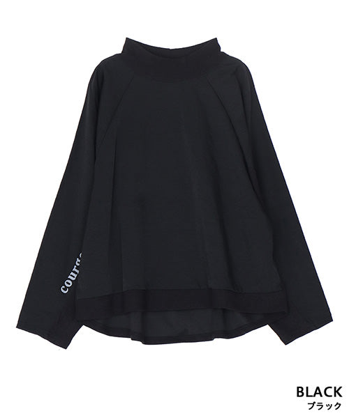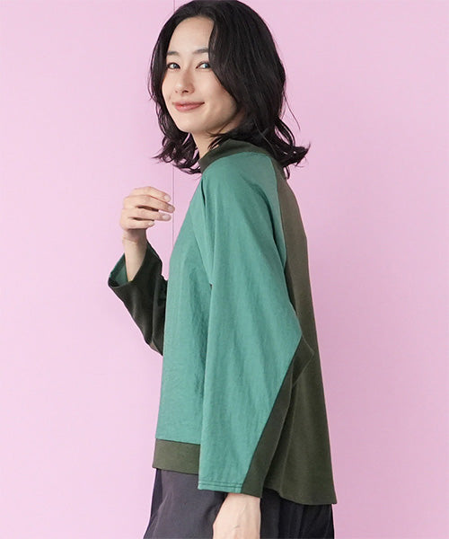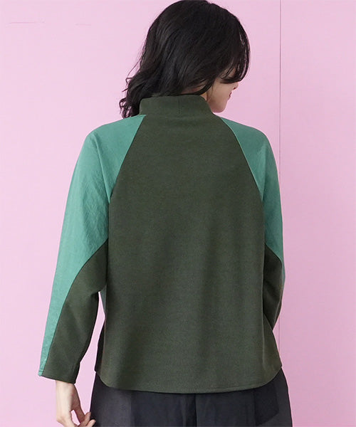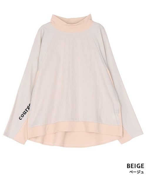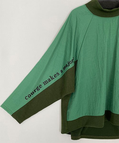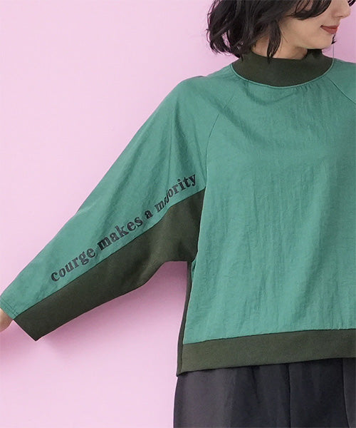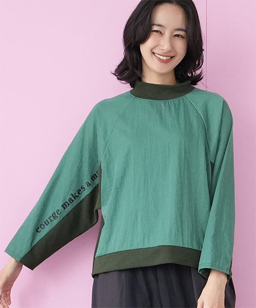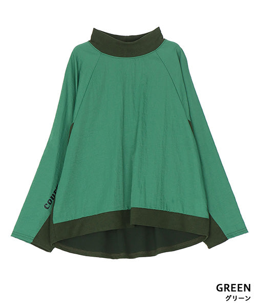 袖の英字プリントがポイントのカットソー。 首元は程よく立ち上がるハイネック仕様で、顔まわりをすっきりと見せつつ、季節の変わり目にも活躍します。 前身頃はシンプルに、襟・袖・裾は異素材で切り替えメリハリを加えています。 裾は前後差のあるシルエットで動きのあるデザインとなっています。 ラグランスリーブで肩まわりにゆとりがあり、リラックスした着心地も魅力です。