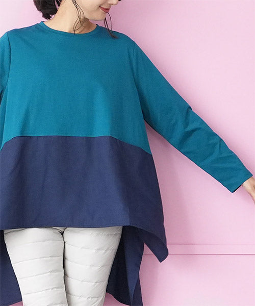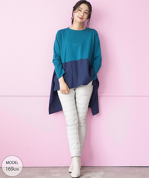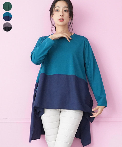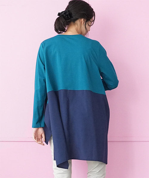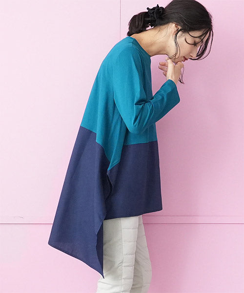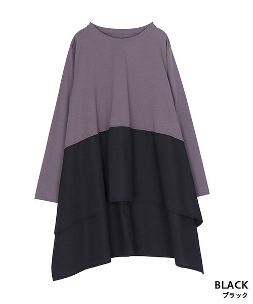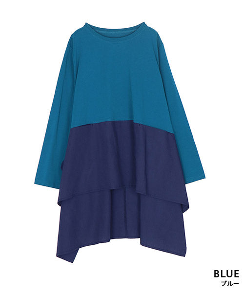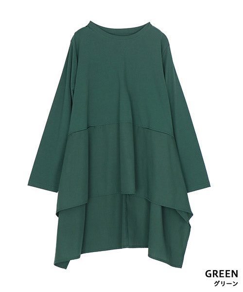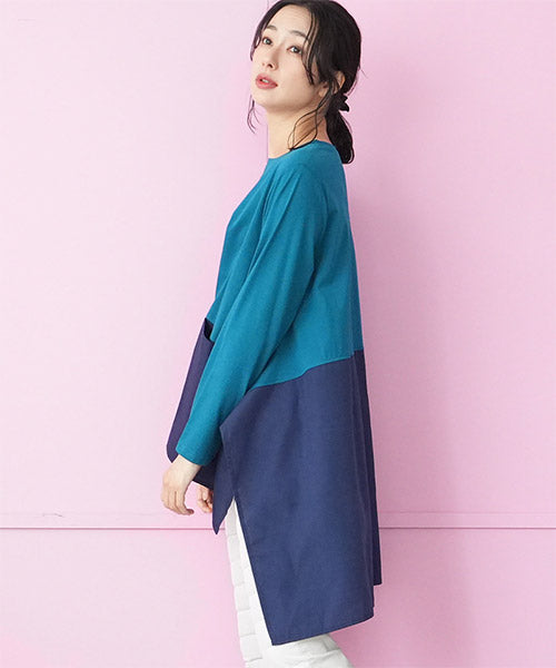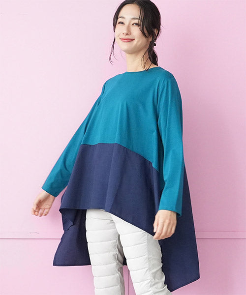 異素材切り替えが目を惹くチュニック。 胸下から大胆に切り替えたフレアシルエットが、動くたびに軽やかなドレープを生み出します。 ヒップまでしっかりカバーする丈感で体のラインを拾いにくく、リラックス感がありながらも洗練された印象です。