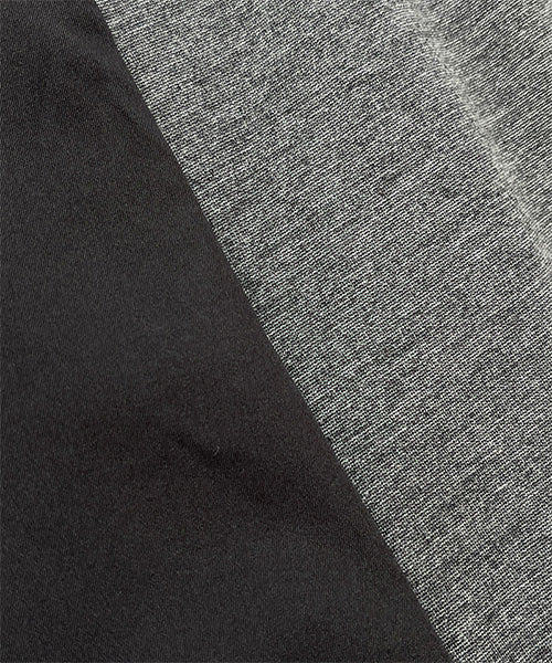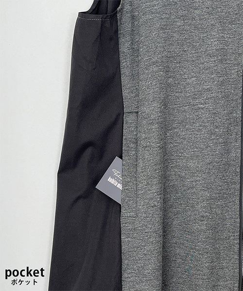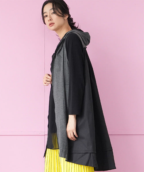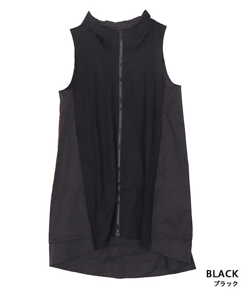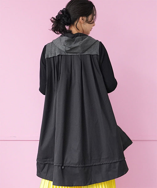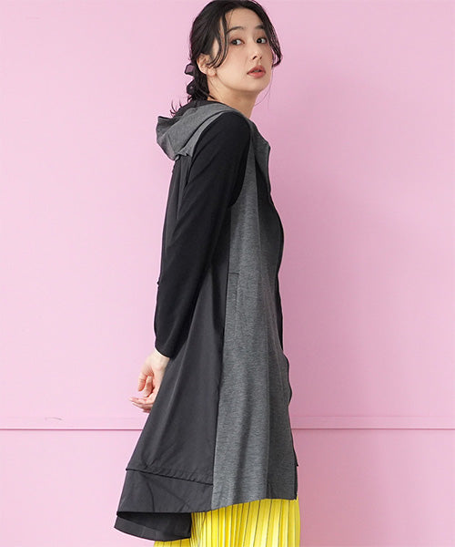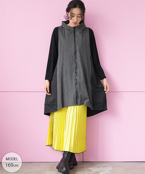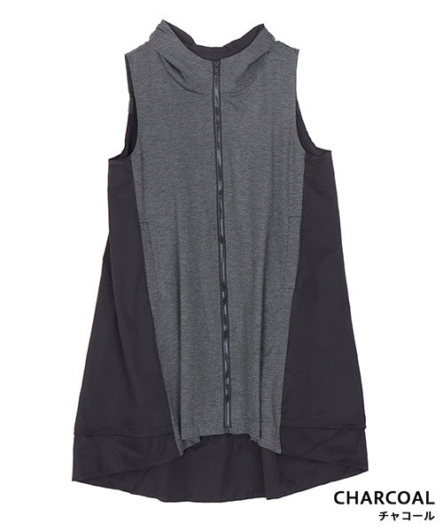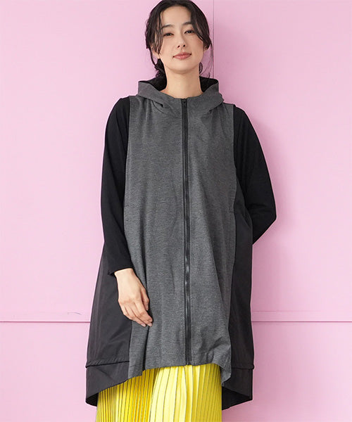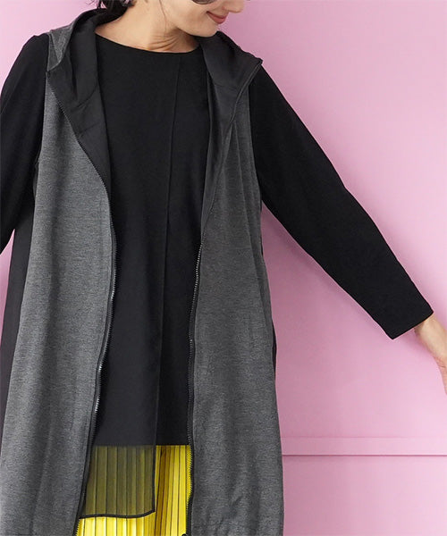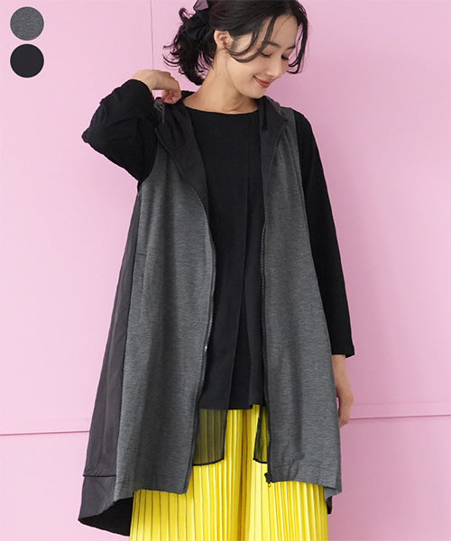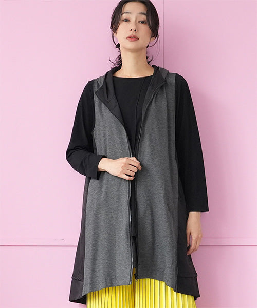 カットソー素材と布帛素材を組み合わせた、異素材デザインが印象的なフード付きジップベスト。 フロントは柔らかなジャージー素材で着心地抜群、サイドと裾にかけての布帛切替が立体感とモードな雰囲気を演出します。 ゆったりとしたシルエットとヒップを覆うロング丈で、体型カバー効果も◎。