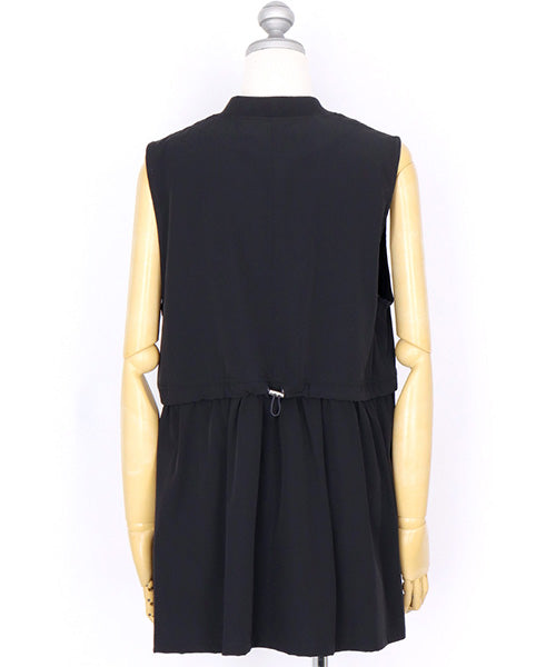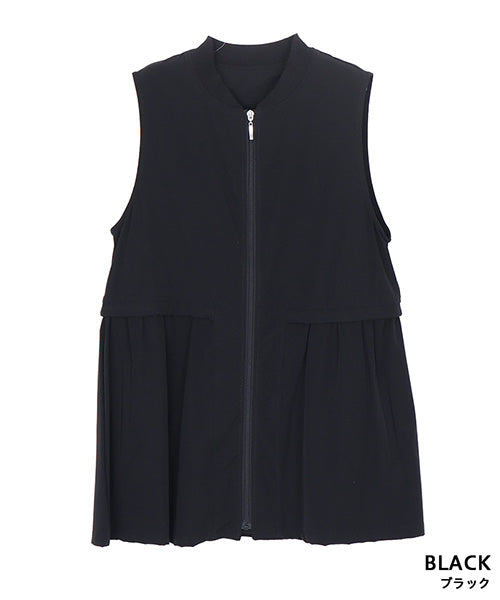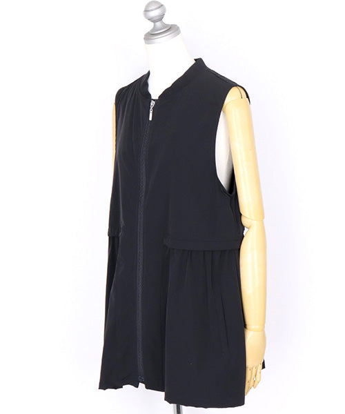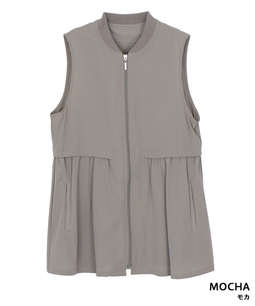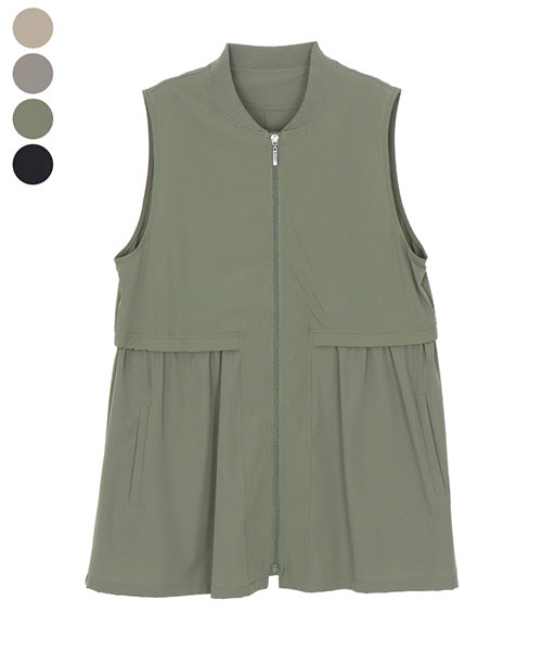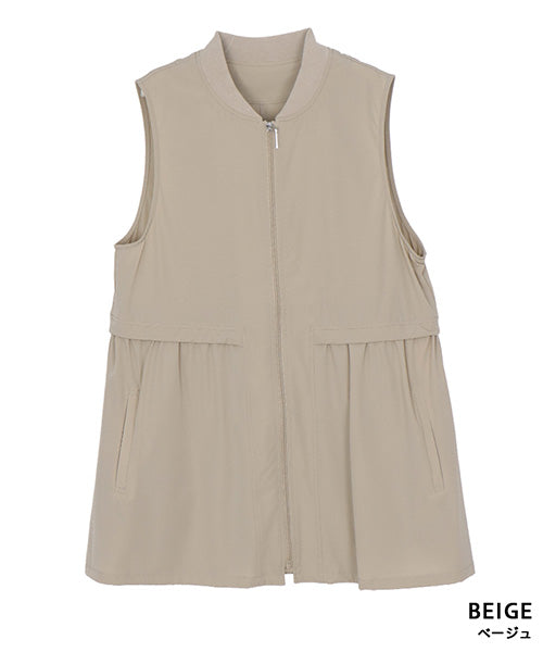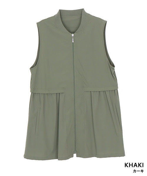 【商品説明】軽やかに羽織れる、大人カジュアルにぴったりの ロングベスト。 上身頃はすっきりとしたノーカラー&ジップデザインで、クリーンな印象に。 ウエスト下からふんわり広がる ギャザー切り替えフレアが女性らしいシルエットをつくり、体型カバーにも効果的です。 旅行やデイリーに便利なポケット付きで、実用性も◎