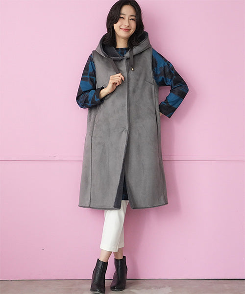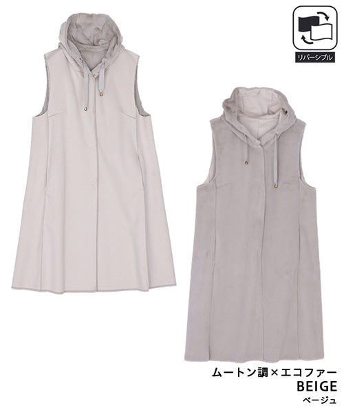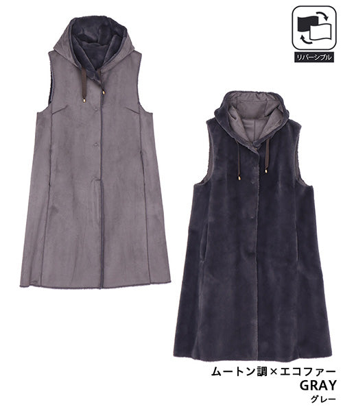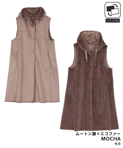 フード付エコファームートン調リバーシブルロングベスト 33-0441