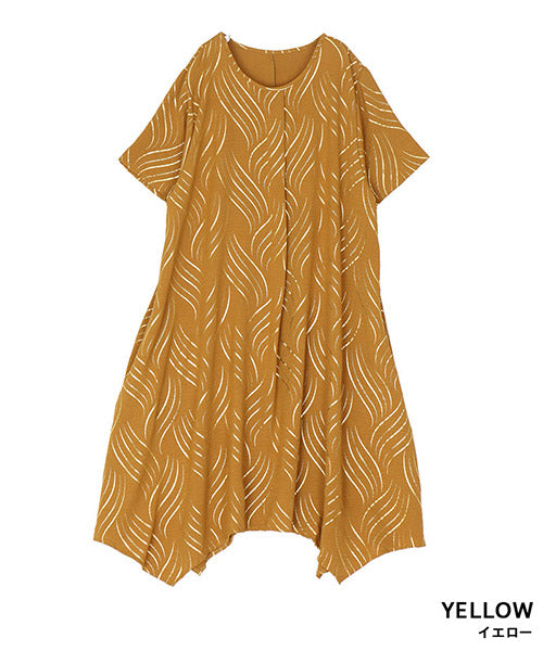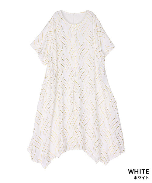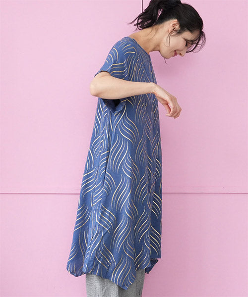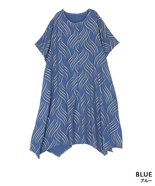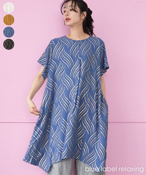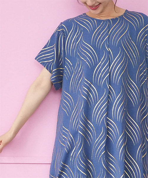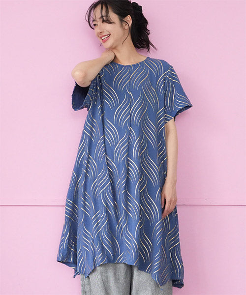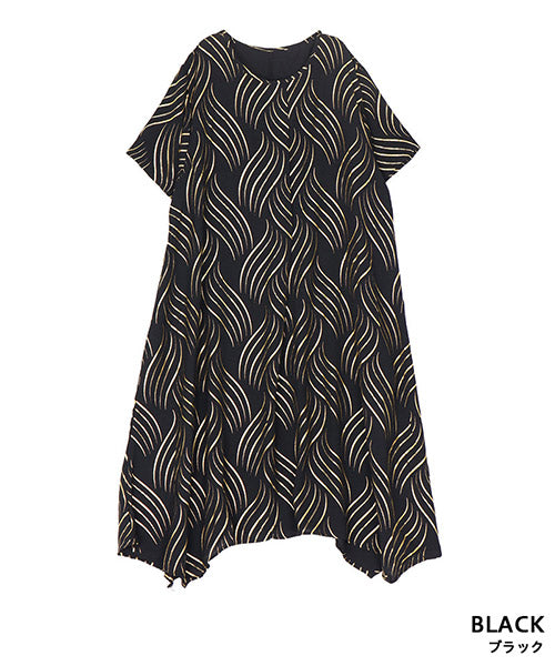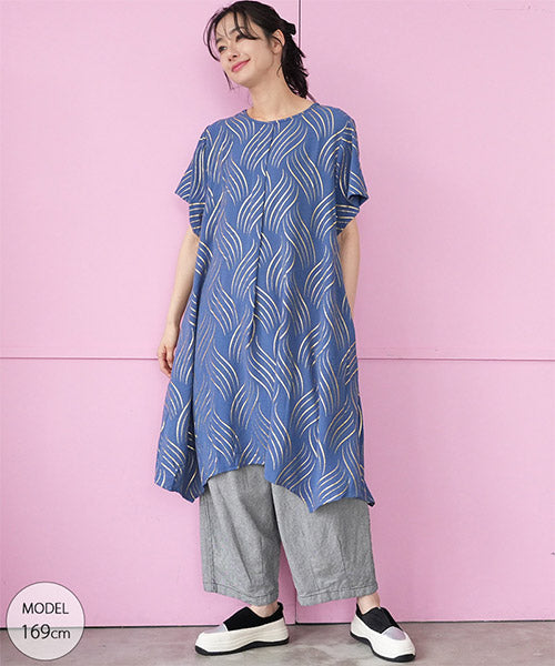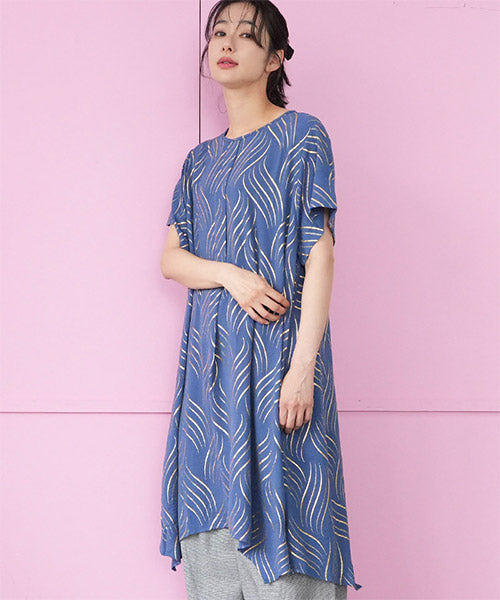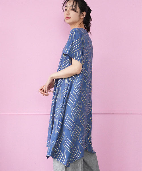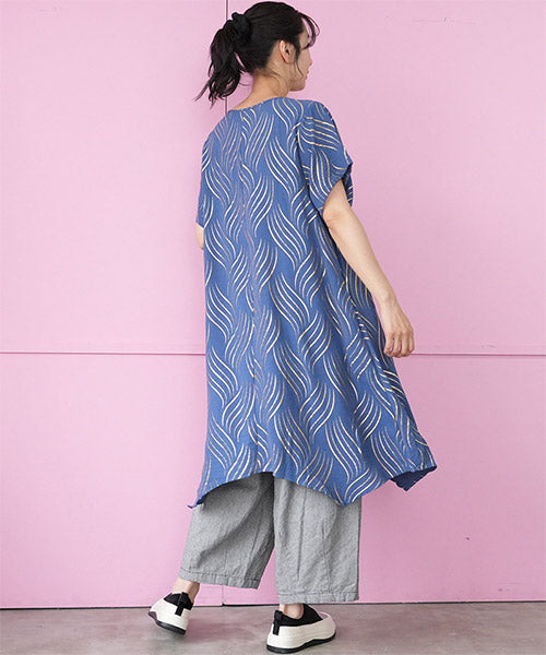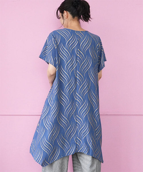 ゴールドの波柄プリントが、和の雰囲気も感じさせる表情のあるチュニックです。 流線形柄の視覚効果と落ち感のある生地で、スッキリ見えが叶います。 前身頃のタックと後ろ中心の切り替えで縦ラインを強調し、スタイルアップが目指せます。 動きのあるイレギュラーヘムが、足のラインを美しく見せてくれます。