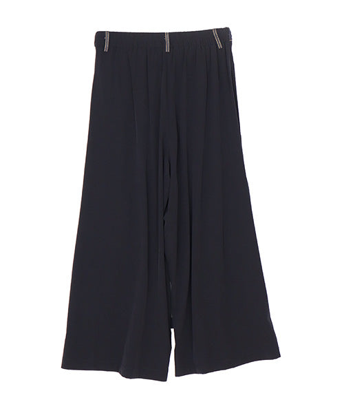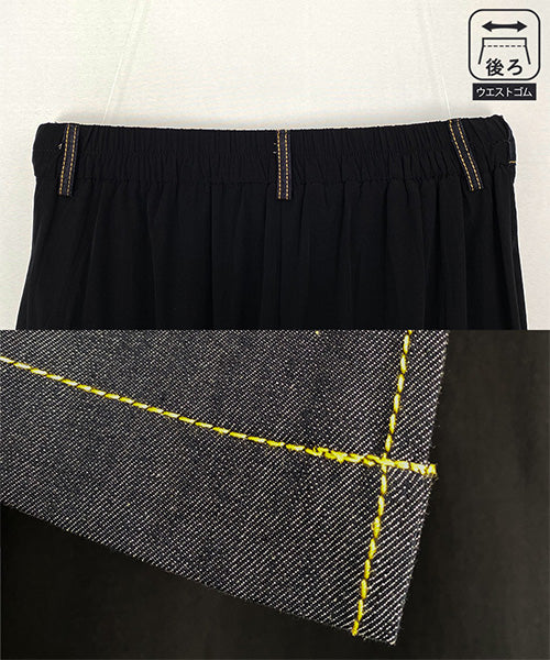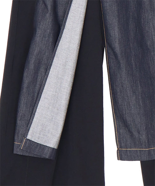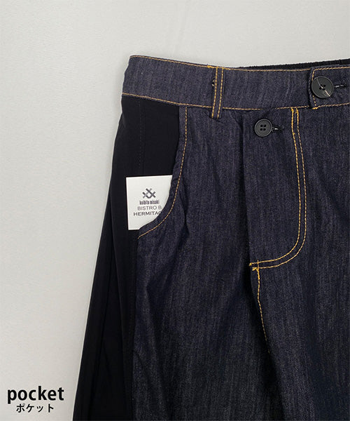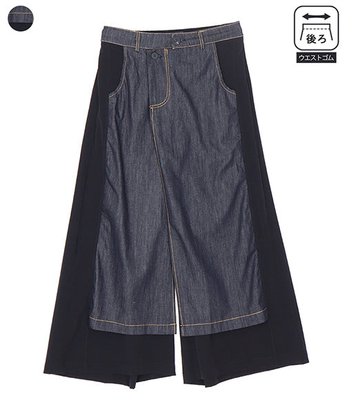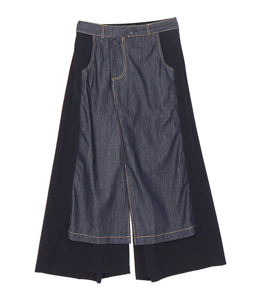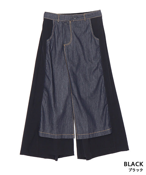 フロントにデニム素材をドッキングした、デザイン性の高いワイドパンツ。 歩くたびにちらりと見えるスリットディテールが、スタイルに抜け感と動きをプラスします。 異素材の組み合わせが立体感を生み、シンプルなトップスを合わせるだけでこなれた印象に。 程よいボリュームのワイドシルエットで体のラインを拾わず、リラックスした穿き心地も魅力です。