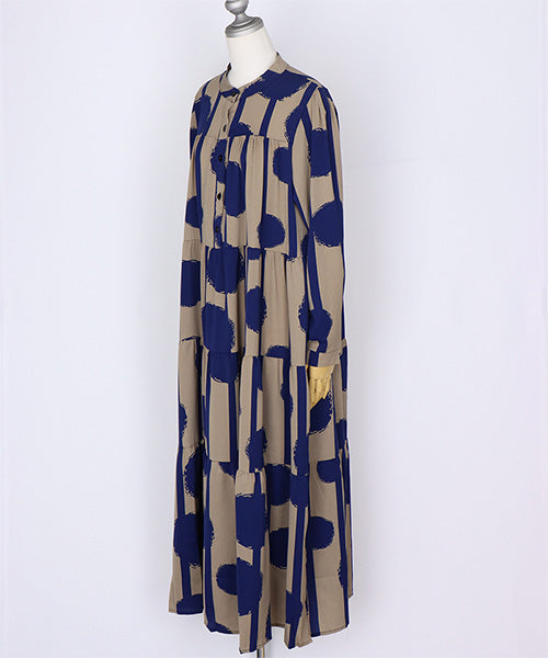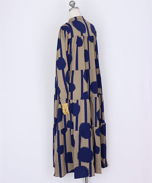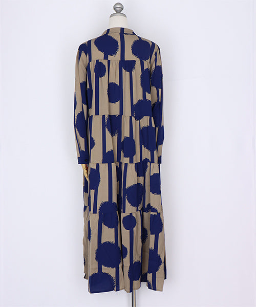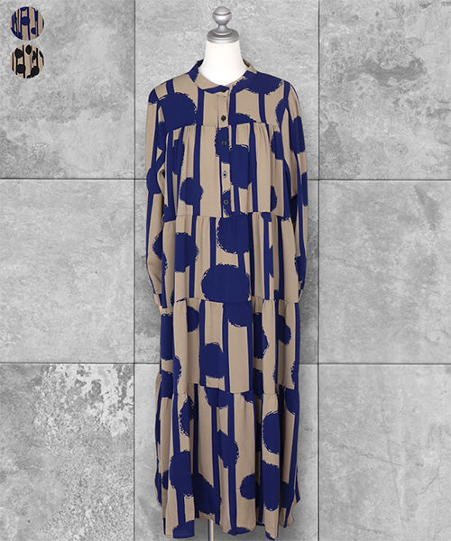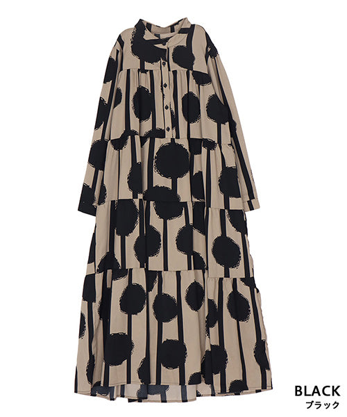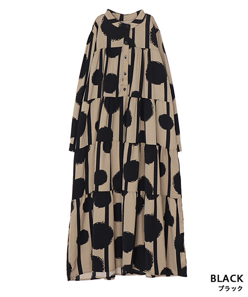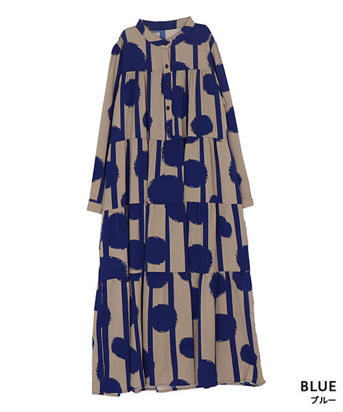 大胆なドット×ストライプ柄が目を惹くワンピース。 ギャザーが入ったティアードデザインが大人可愛い印象をプラスしてくれます。 たっぷり広がるAラインシルエットが気になるボディラインをカバー。 1枚でコーディネートが完成するおすすめアイテムです。