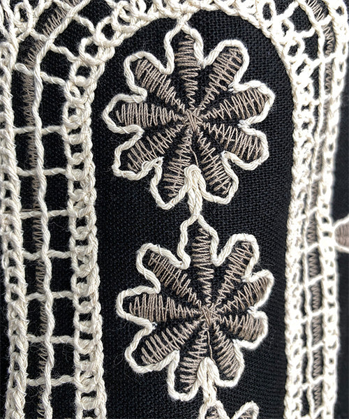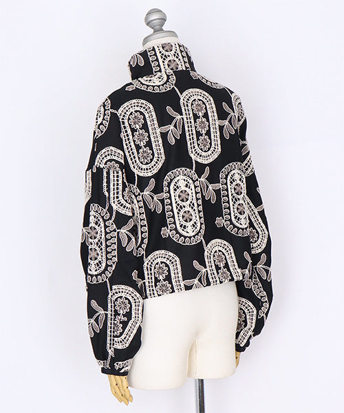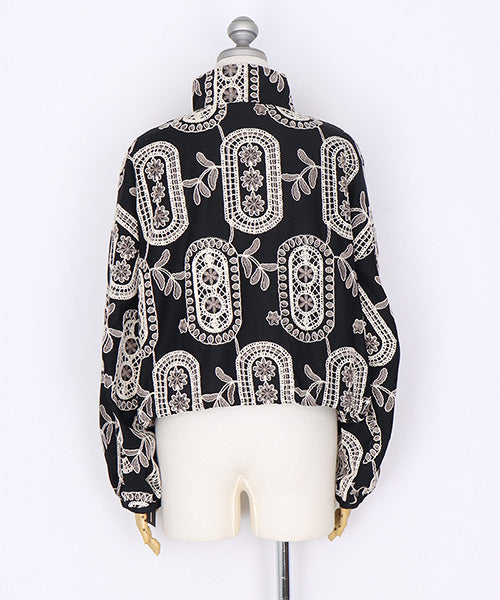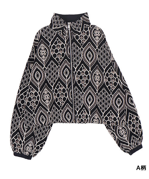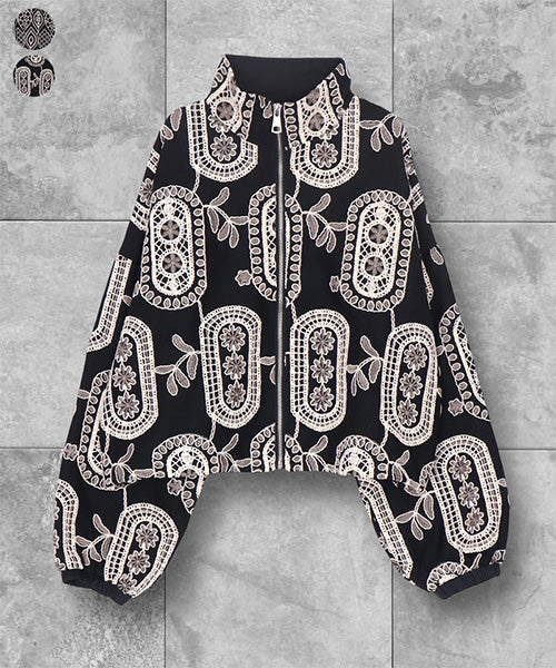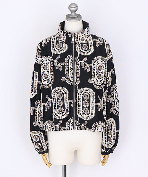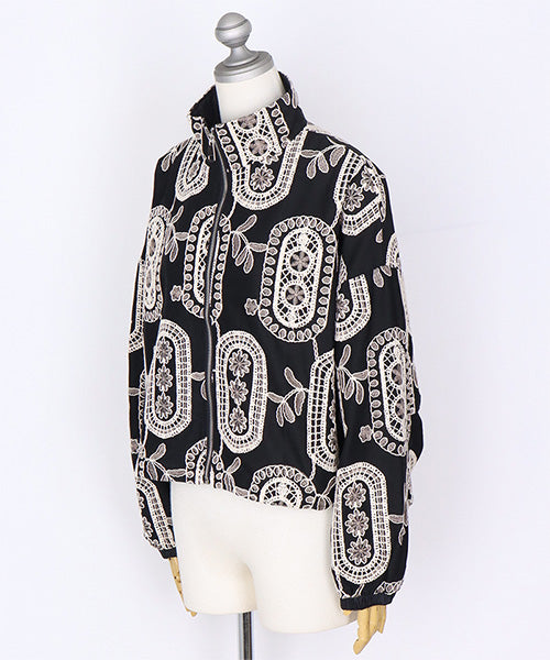 大胆なモノトーンの総柄刺繍が目を惹くジップアップジャケット。
