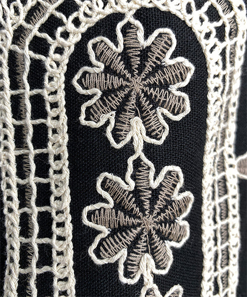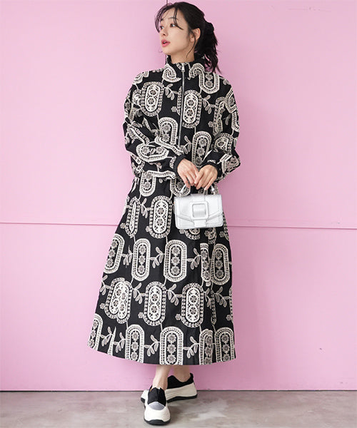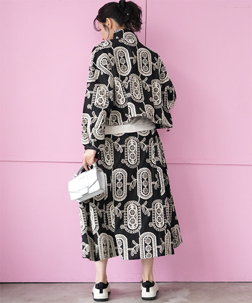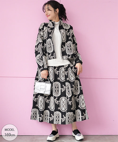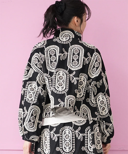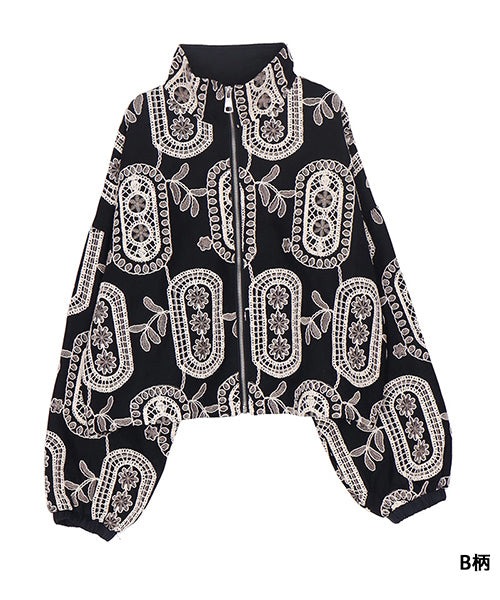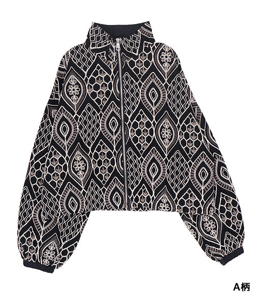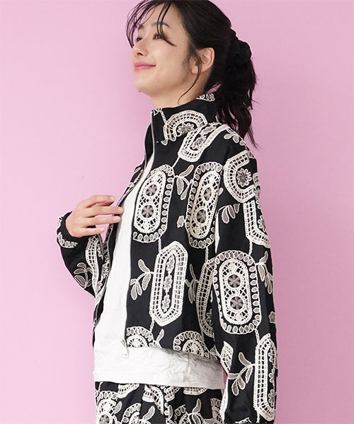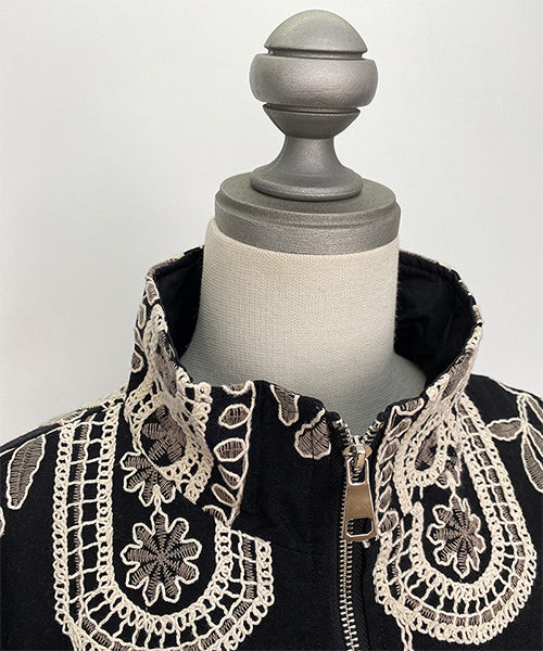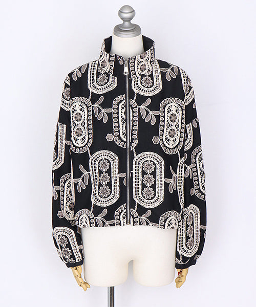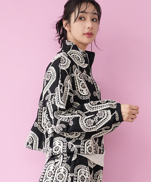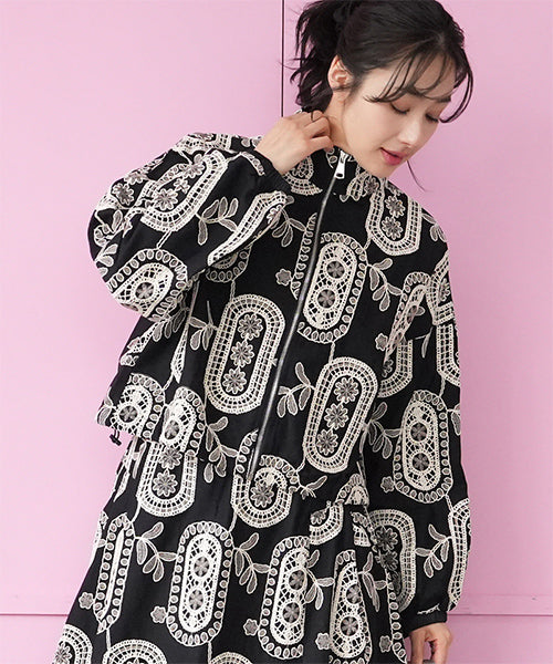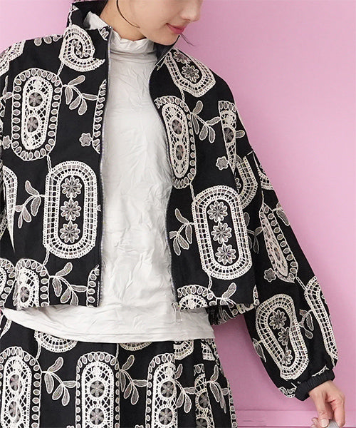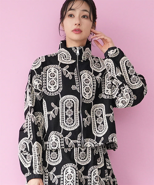 大胆なモノトーンの総柄刺繍が目を惹くジップアップジャケット。 ゆったりとした袖とコンパクトな丈感で、カジュアルにもフェミニンにも着回しやすいデザイン。 さらりとした生地感で、軽やかに羽織れる1枚です。 程よくショート丈に仕上げることで、ボトムスとのバランスが取りやすく、スタイルアップ効果も期待できます。 ジップを閉めてコンパクトに着るのはもちろん、軽く開けてインナーを見せる着こなしもおすすめです。