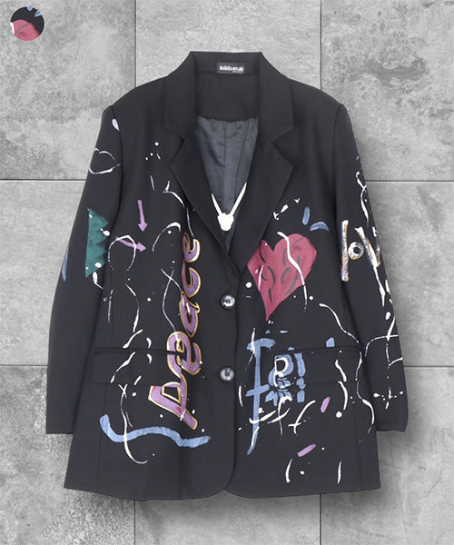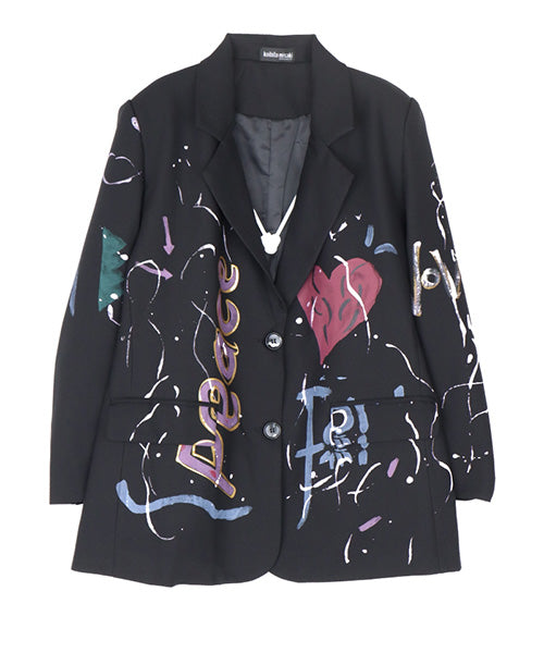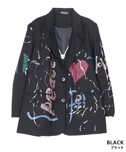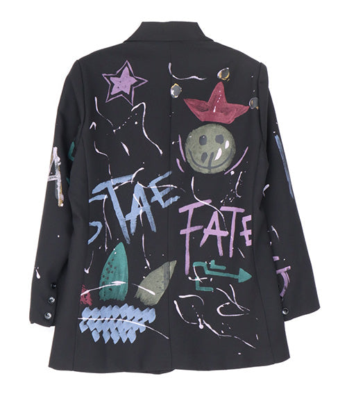 手書き風のイラストプリントが映えるブラックのテーラードジャケット。 スーツスタイルに合わせても、カジュアルなコーディネートにもマッチするアイテムです。 ポリエステル素材なので、軽くて動きやすく、快適な着心地となっています。