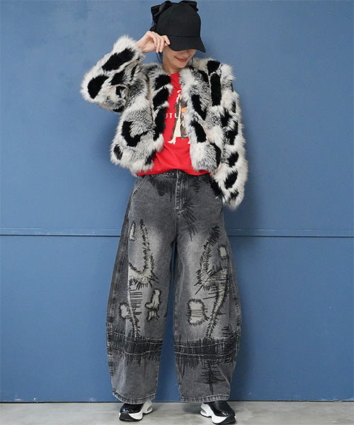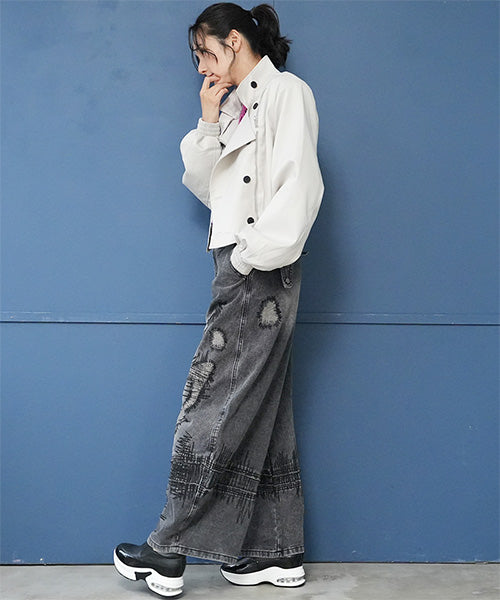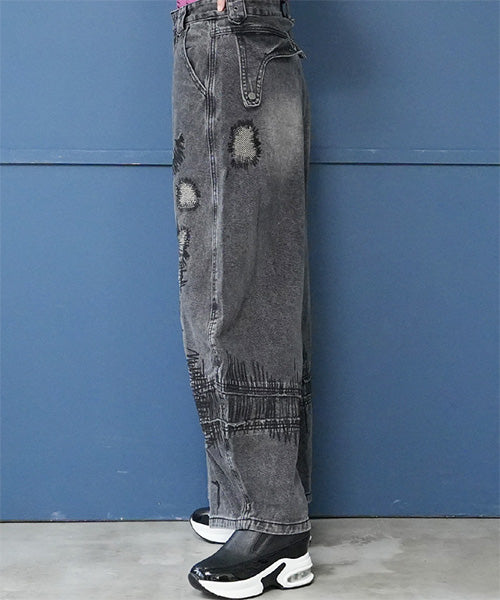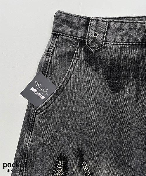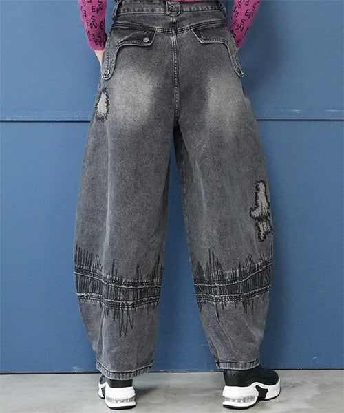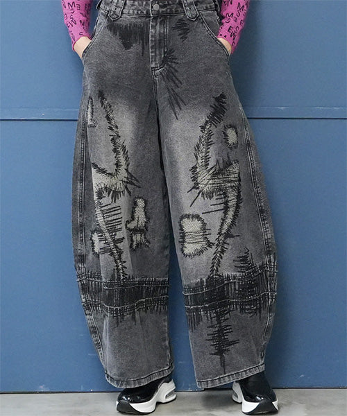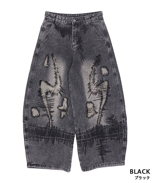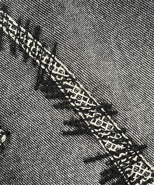 ヴィンテージ感のあるグレーウォッシュに、大胆な抽象的ステッチデザインを施し、まるでアートのような1本に仕上げました。