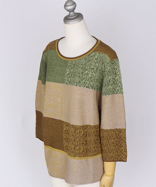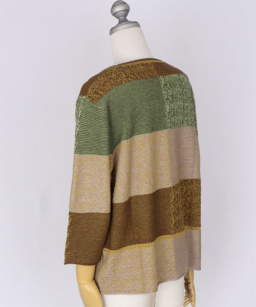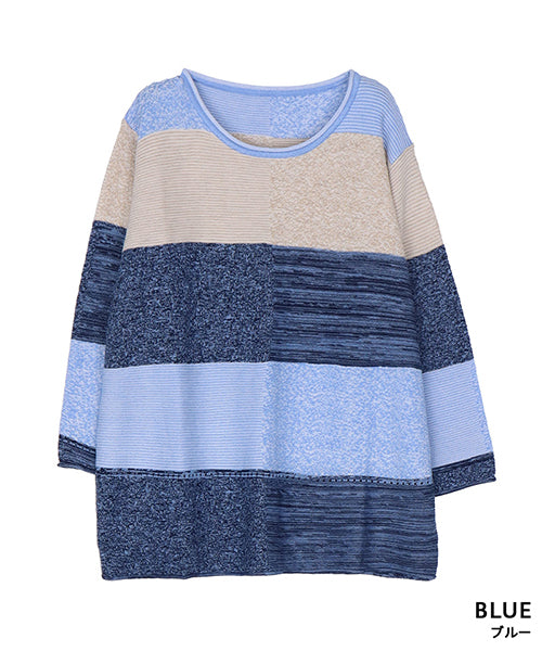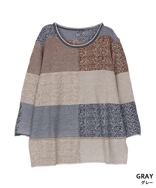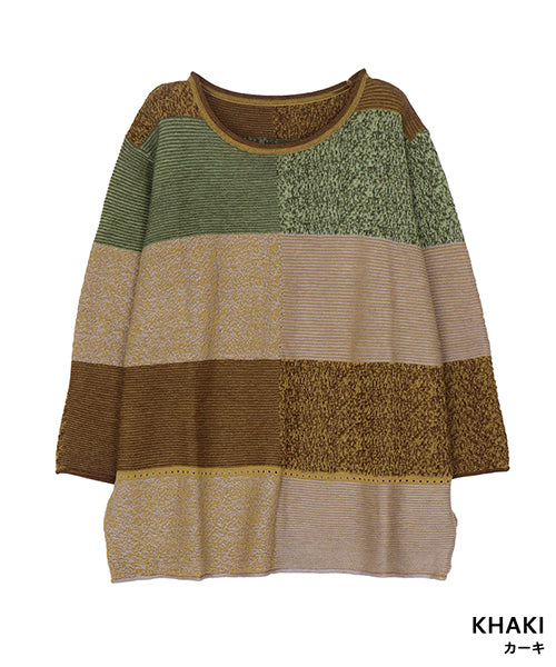 異なる素材感と色合いを組み合わせた、カラーブロックデザインのニットプルオーバー。