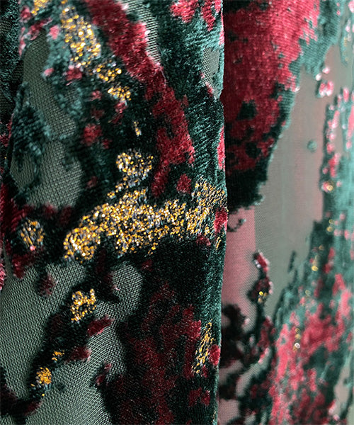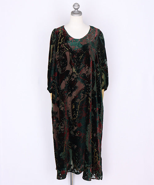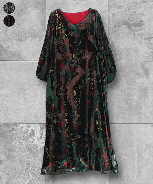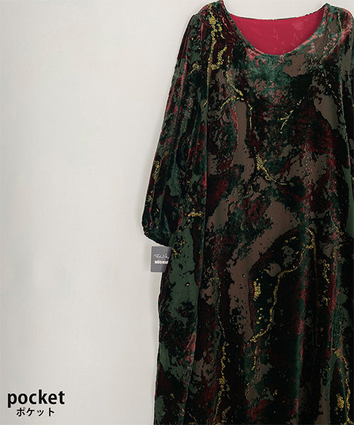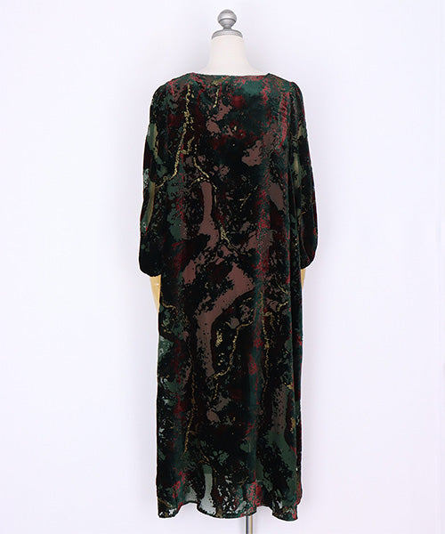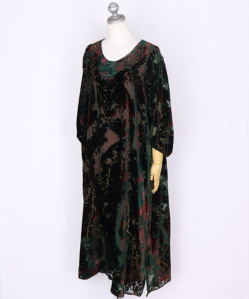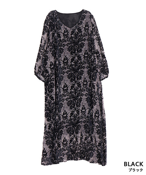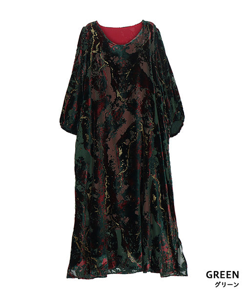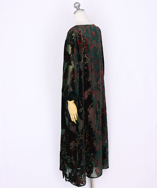 艶やかなベルベット調の柄使いが映えるロングワンピース。