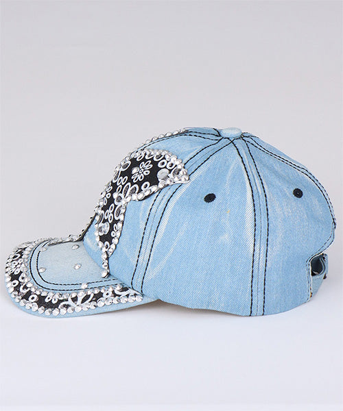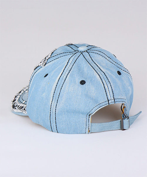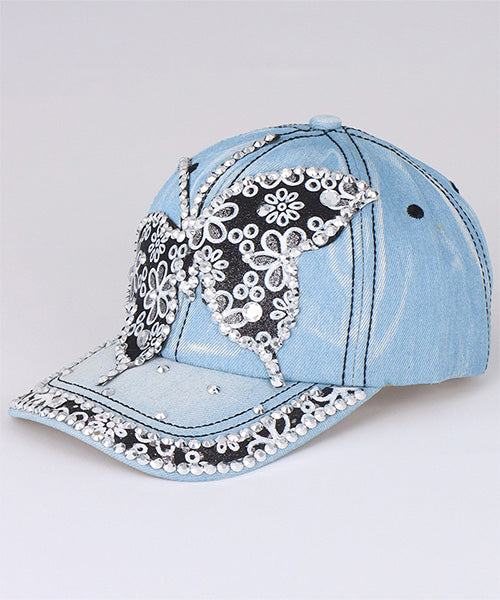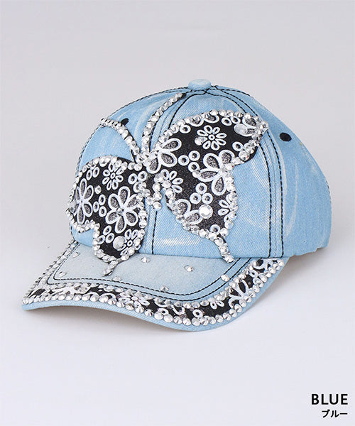 大きなバタフライモチーフが印象的な、ビジュー付きデニムキャップ。
