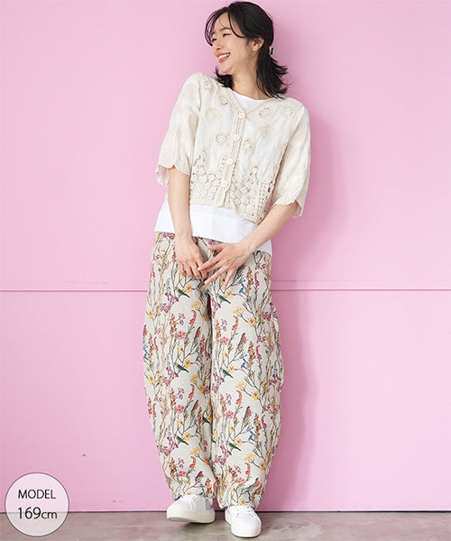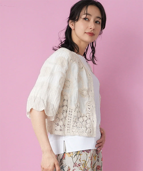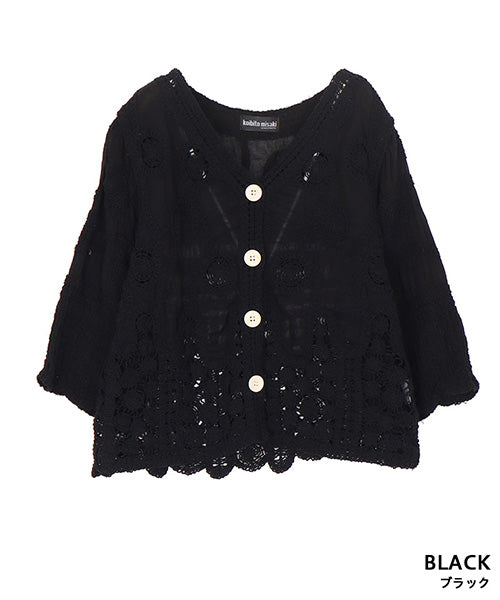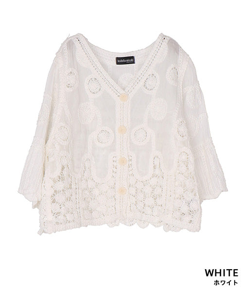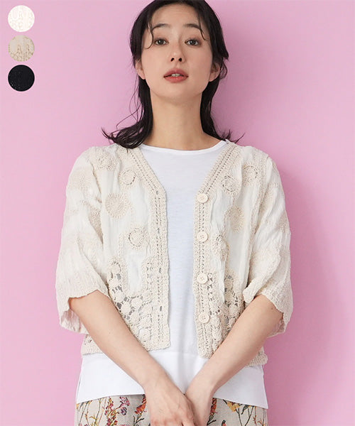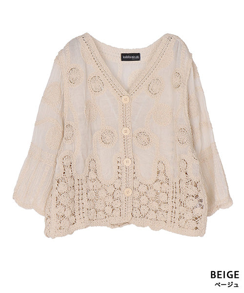 総刺繍レースが美しいブラウスタイプのカーディガンです。 綿100%なので肌あたりが良くストレスを感じにくくなっています。 Vネックのゆったり身頃なので、インナーとのレイヤードも楽々です。 シアータイプはトレンド感満載です。
