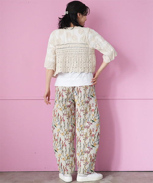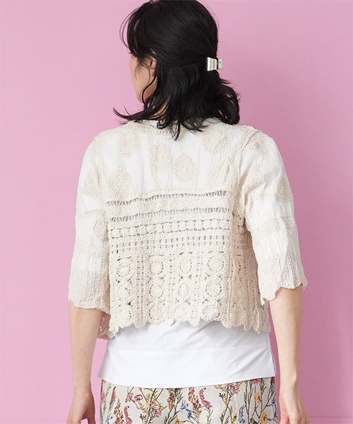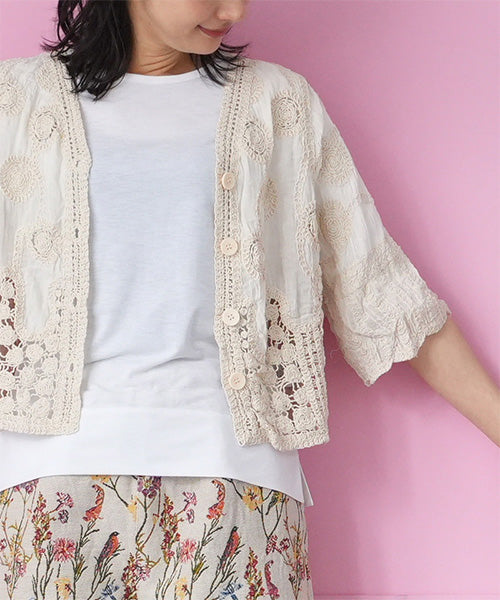 綿100%Vネック6分袖刺繍ショートカーディガン 06-3017
