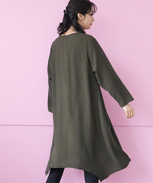 長めの袖丈とラウンドネックが、大人っぽく落ち着いた印象です。
