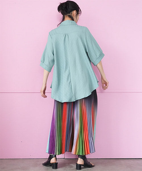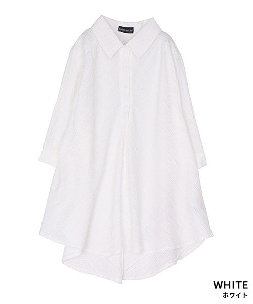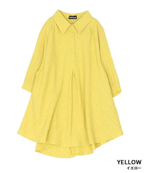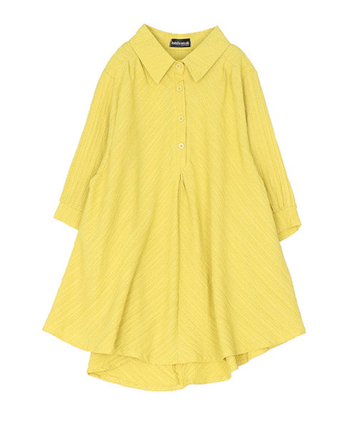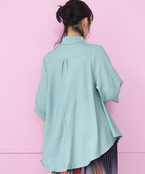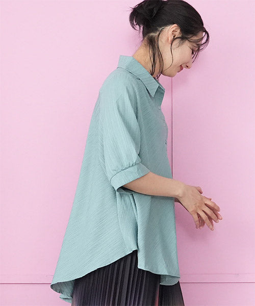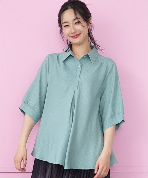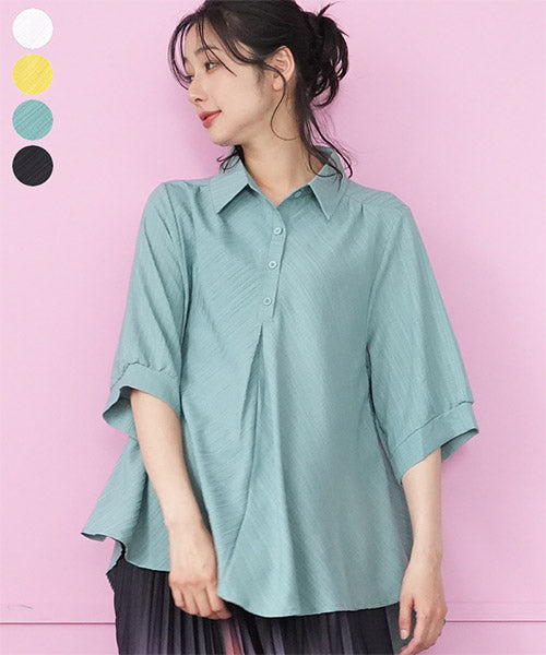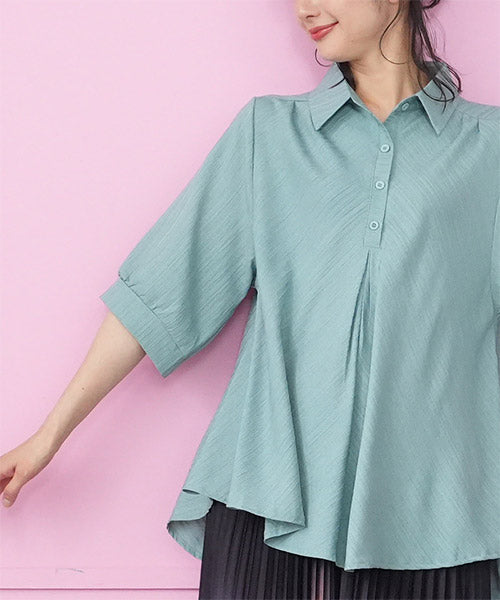 タックやギャザーを施し、デザイン性を高めたプルオーバーブラウスです。 ゆったりとしたAラインで、ストレスフリーの着心地です。 シボ感のある生地が肌に優しく馴染みます。 フィッシュテール加工でヒップまわりも安心です。