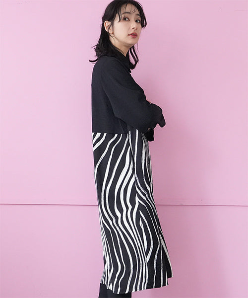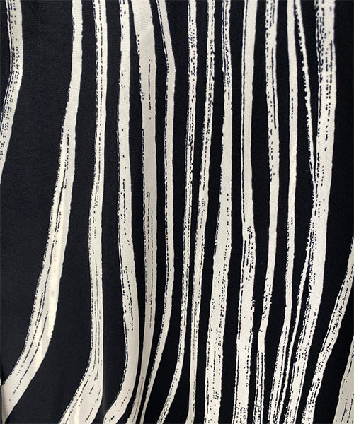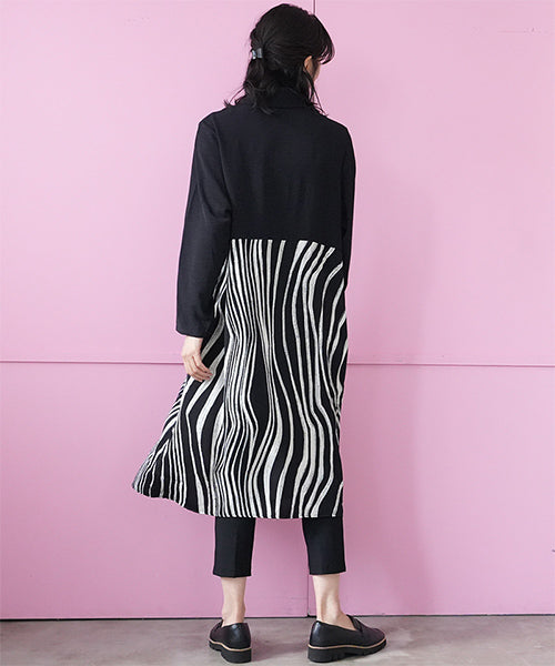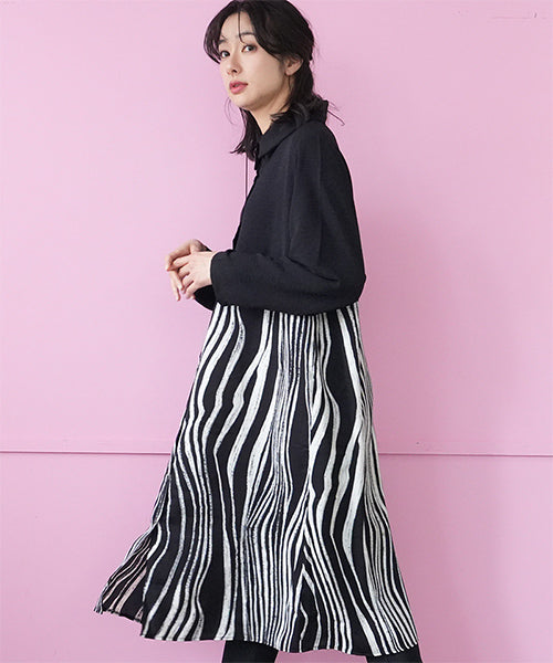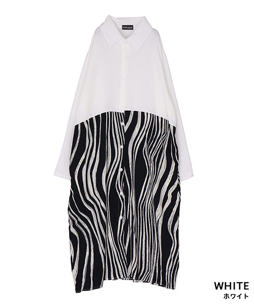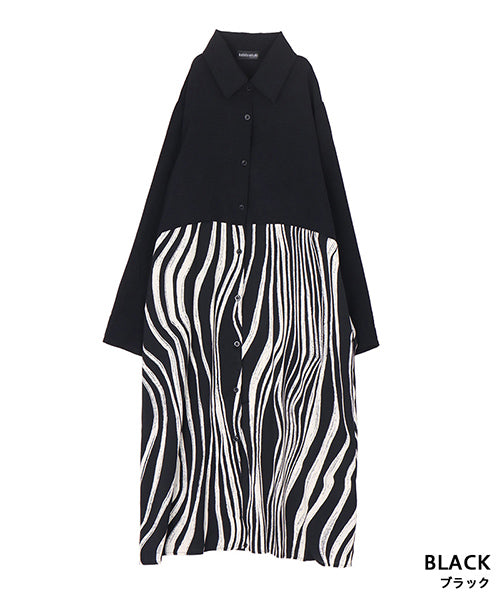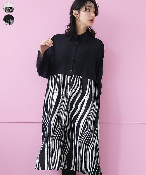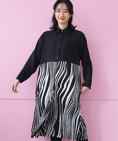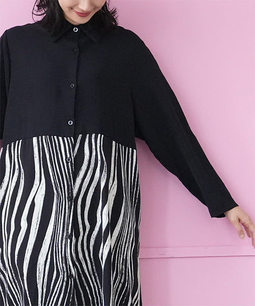 流れるようなラインプリントが印象的な、切り替えデザインのシャツワンピース。