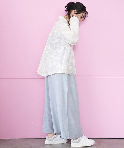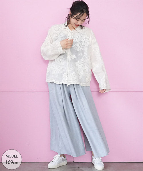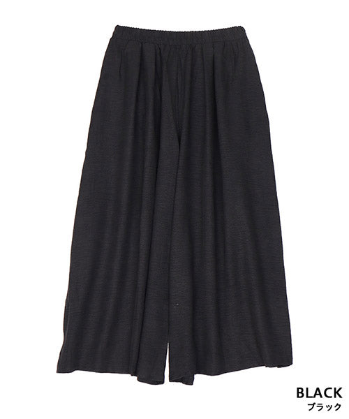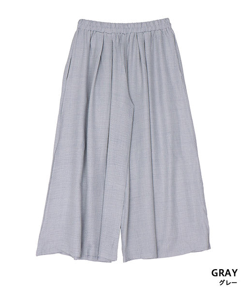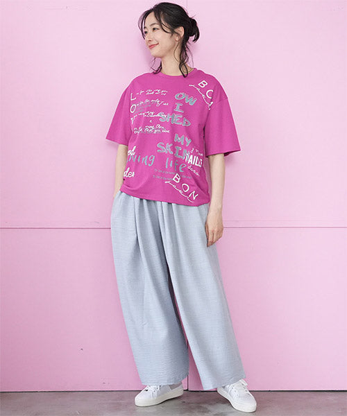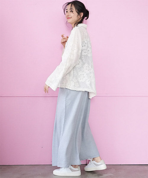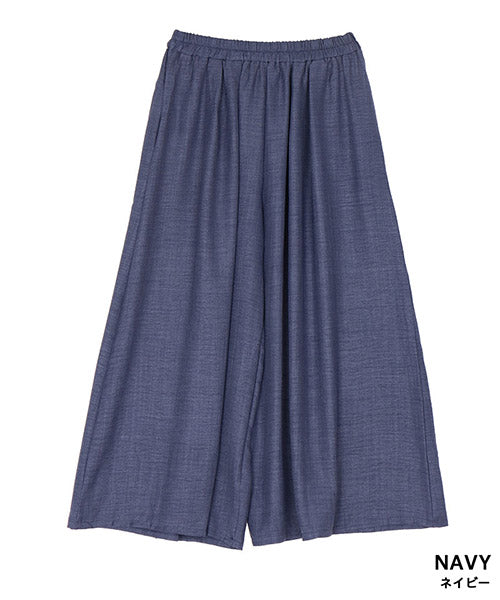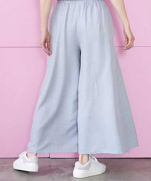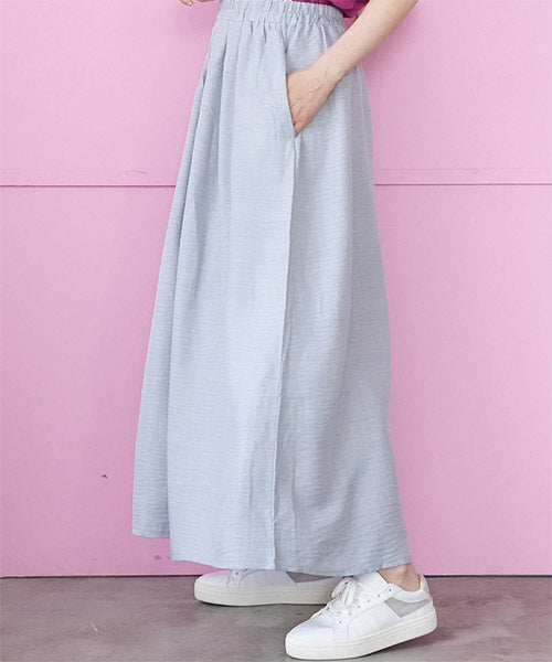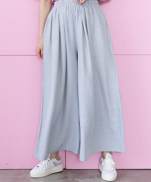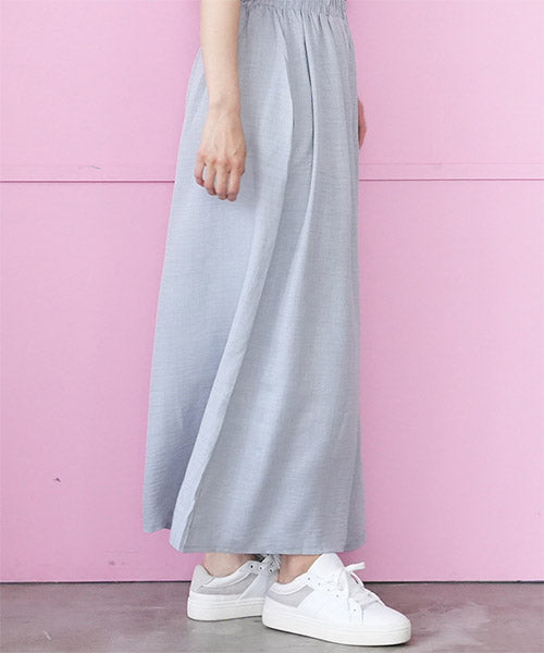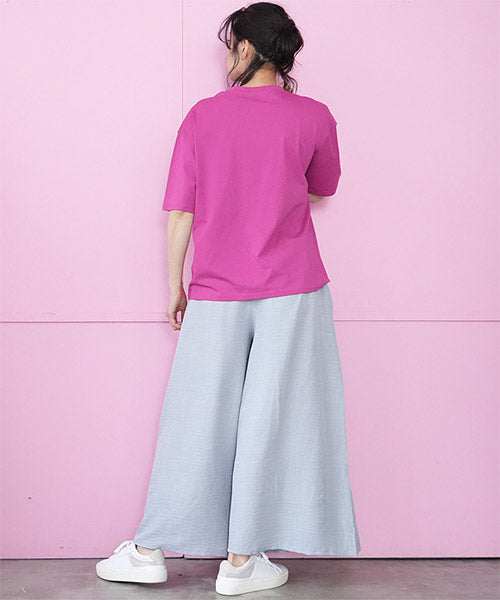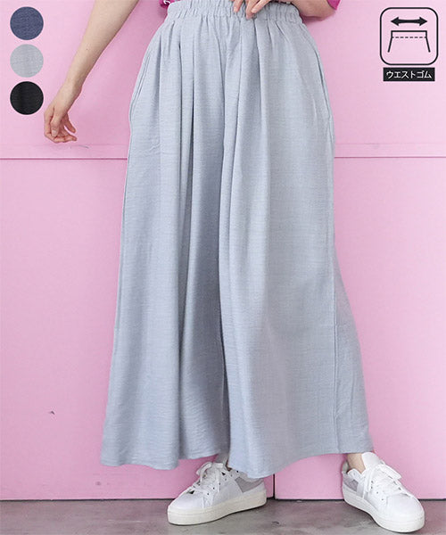 サラリとした素材で、ワイドパンツより少し太めのバギーパンツです。 ウエストのゴムは中心にステッチをたたいているので、よれにくくなっています。 ワイドタイプはレッグラインを拾わず、脚長効果も期待できます。 全体的にたっぷりゆとりがあるので、肌に付かず汗ばむ季節も涼しく穿くことができます。