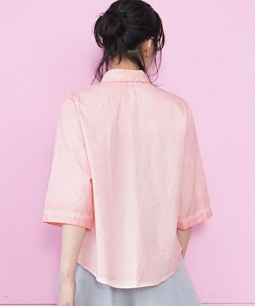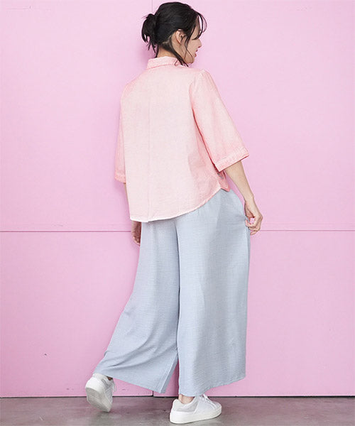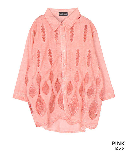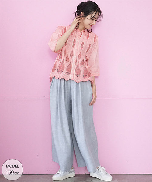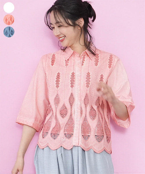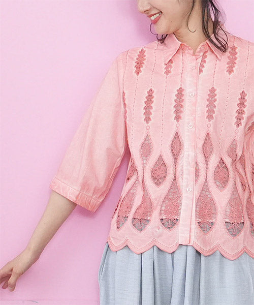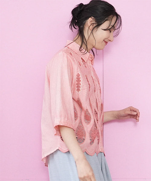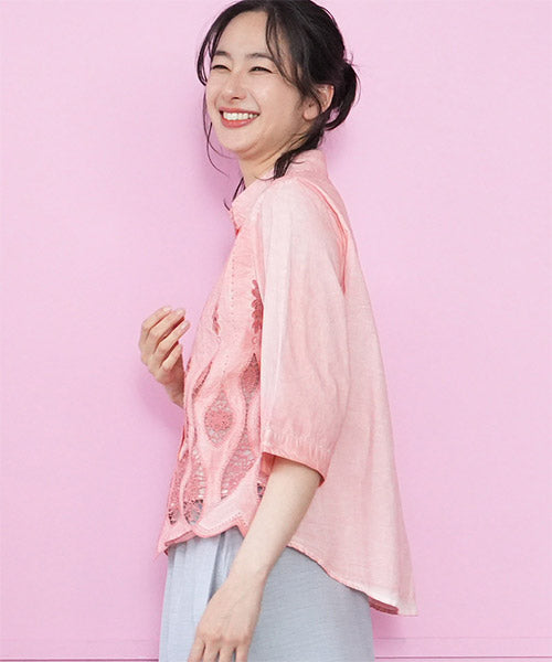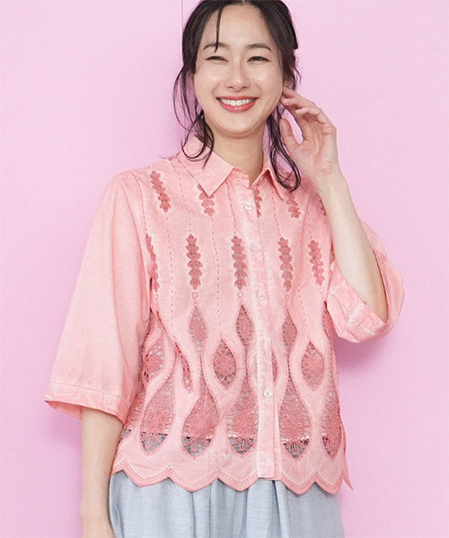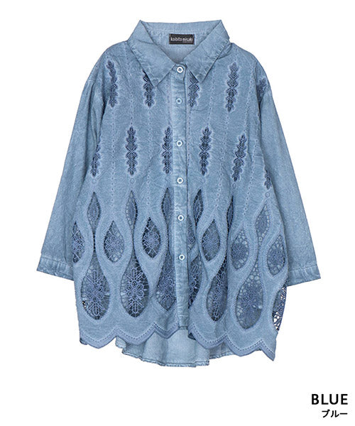縦ラインを強調したコード刺繍のシャツブラウスです。 ゆったりめの六分袖なので、二の腕と肘をしっかりカバーします。 ムラ染風のカラーが落ち着いたカジュアル感を出しています。 フロント裾のスカラップ刺繍が、大人の脱カジュアルの魅力を表現しています。
