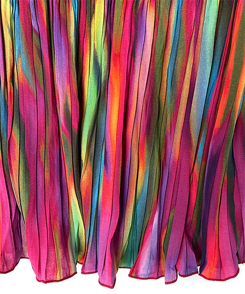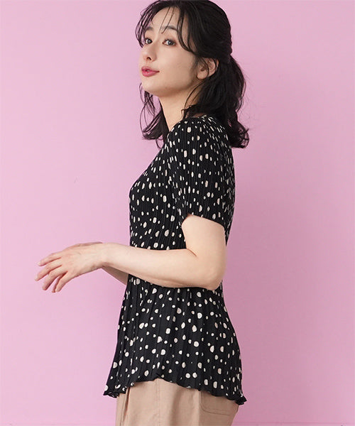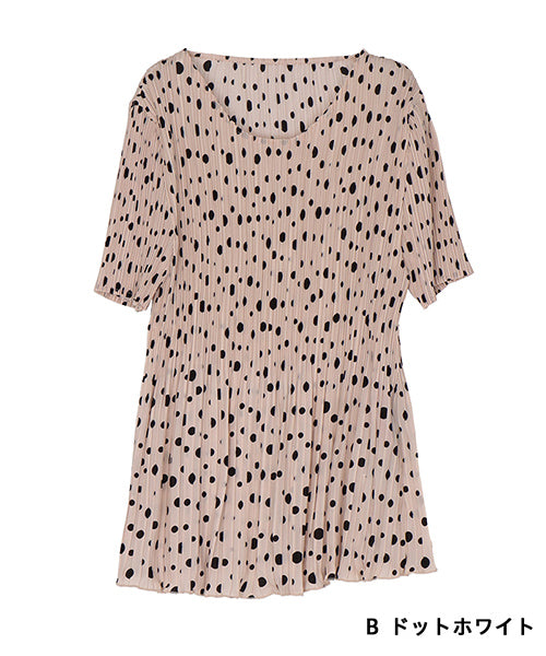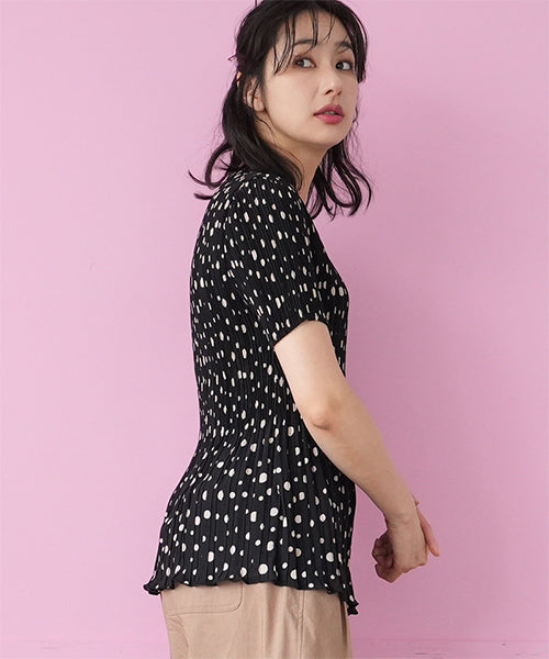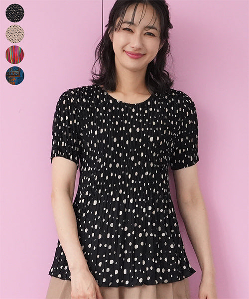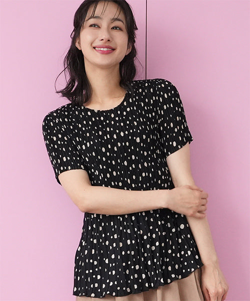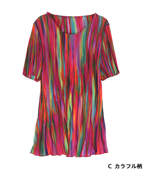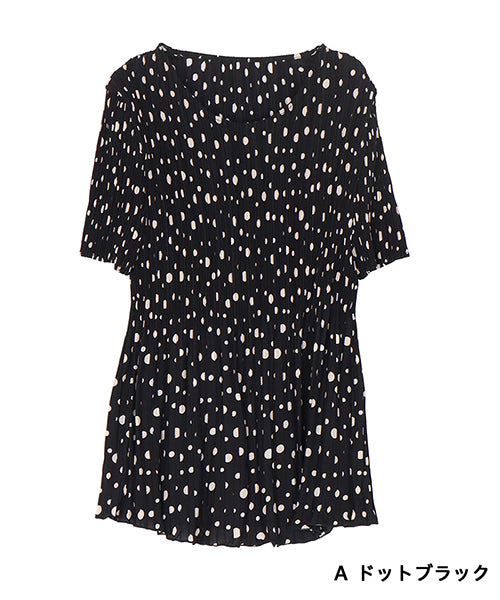 縦ラインを強調するリブプリーツ素材に、プリントをのせた華やかなプルオーバー。