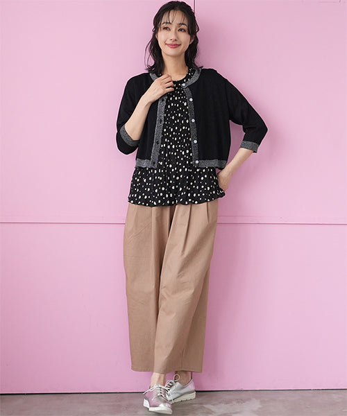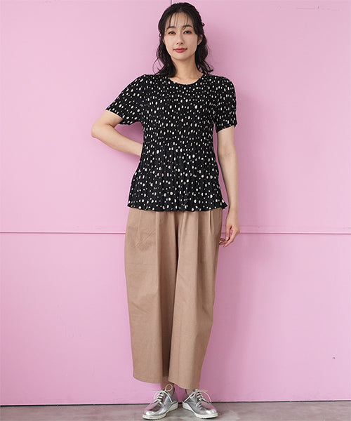動くたびに揺れるプリーツが軽やかで、体のラインを拾わず自然にすっきり見せてくれます。