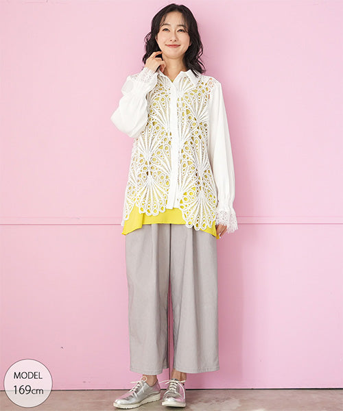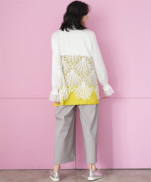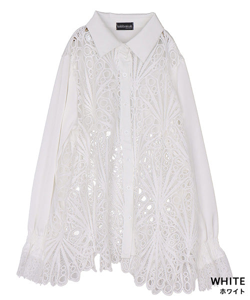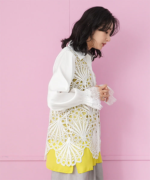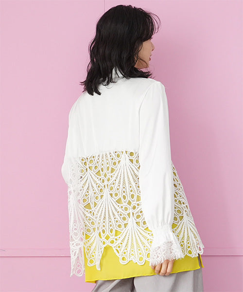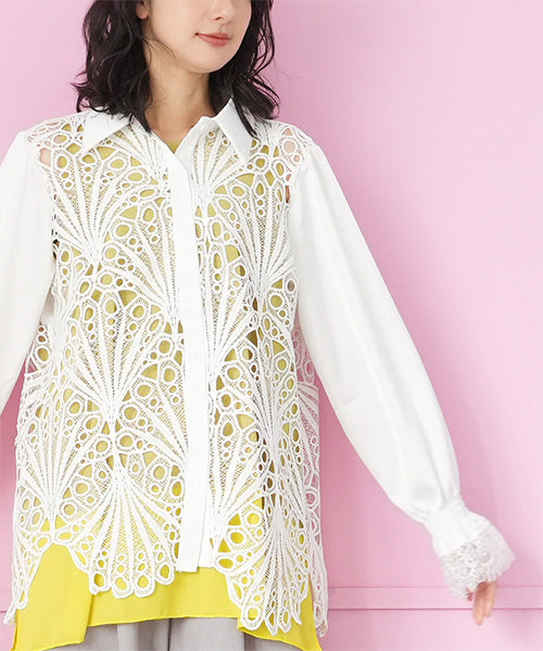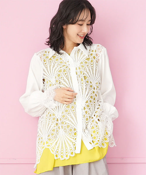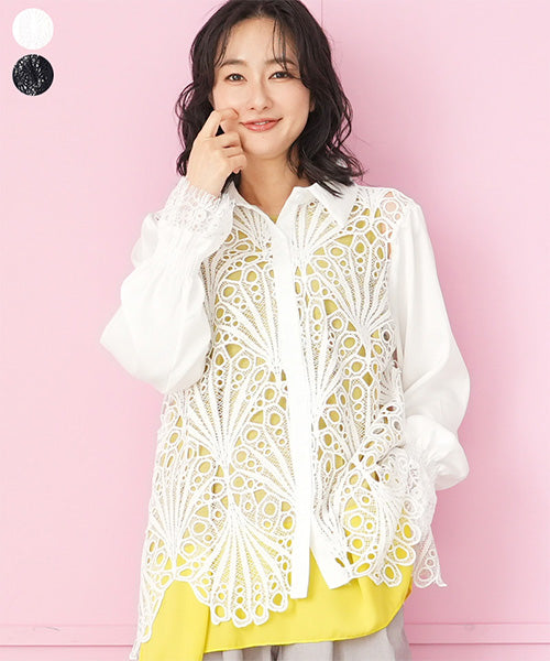 フロントは総レース刺繍、バックは下半分のみレース刺繍と変化をつけたシャツブラウスです。