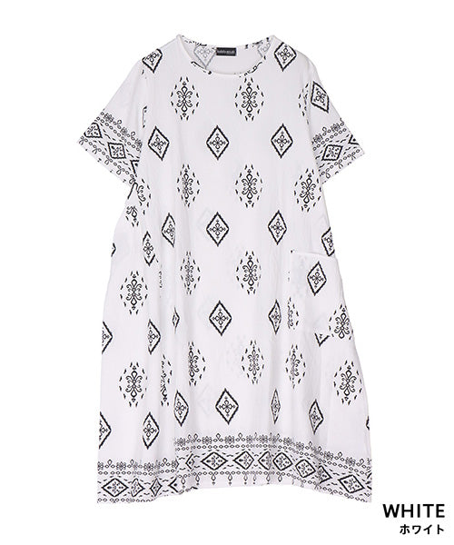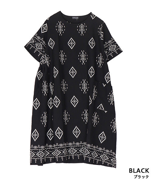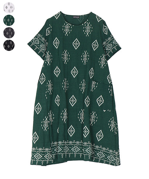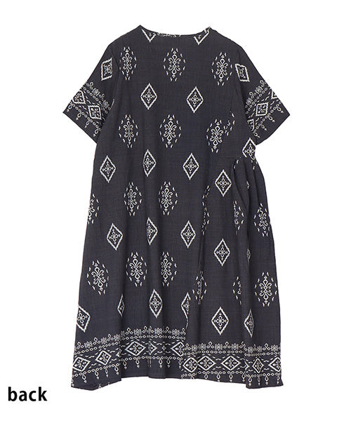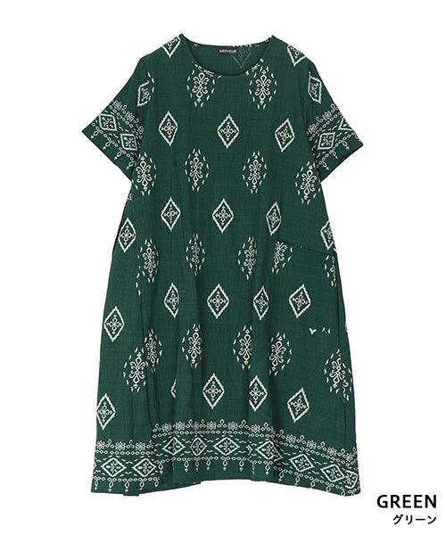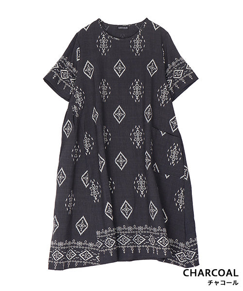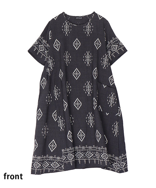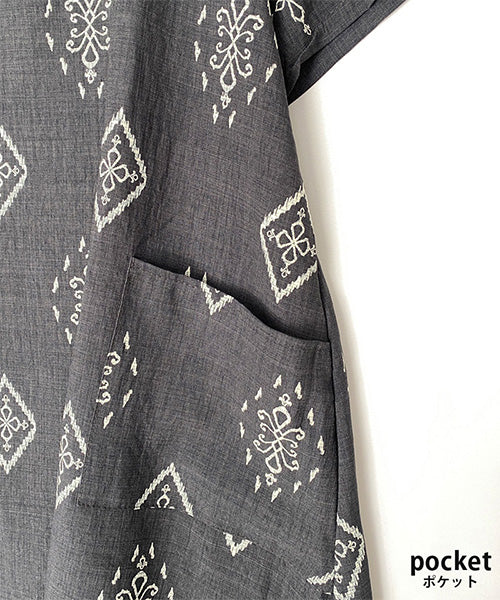 エスニックなオリエンタルプリントの半袖チュニックワンピースです。 特徴的なビッグポケットと脇の切り替えが、お洒落なシルエットになっています。 しっとりサラッとした質感が、心地良い着用感です。 ワイドなフォルムと幅広袖が、涼しいを呼び込みます。