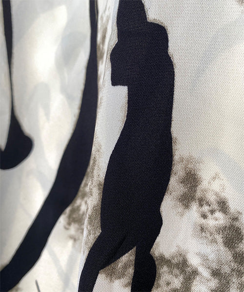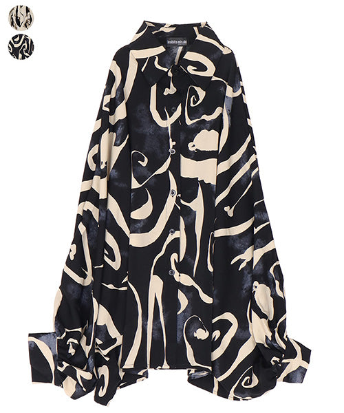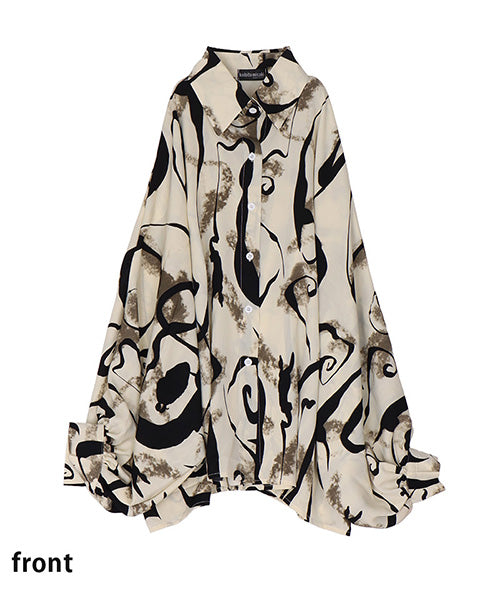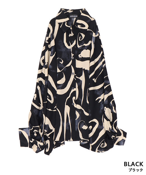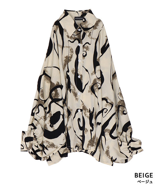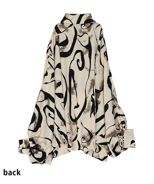 大胆なアート柄に、ボリューミーな袖が魅力的なシャツブラウスです。