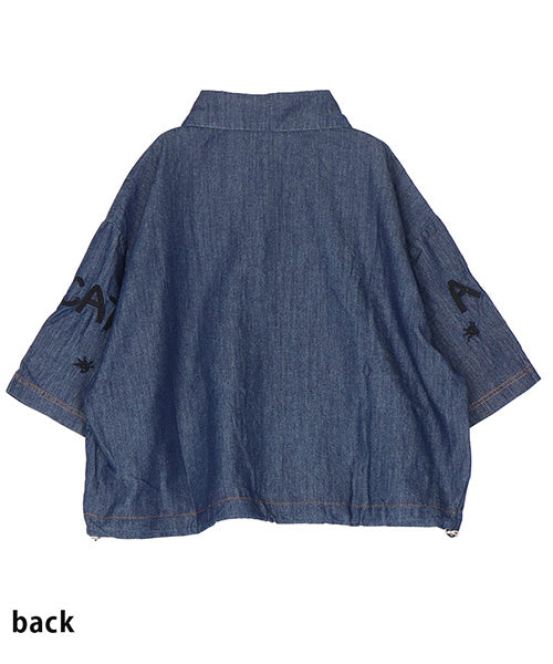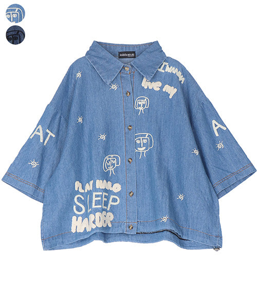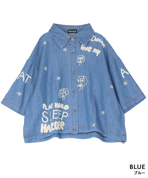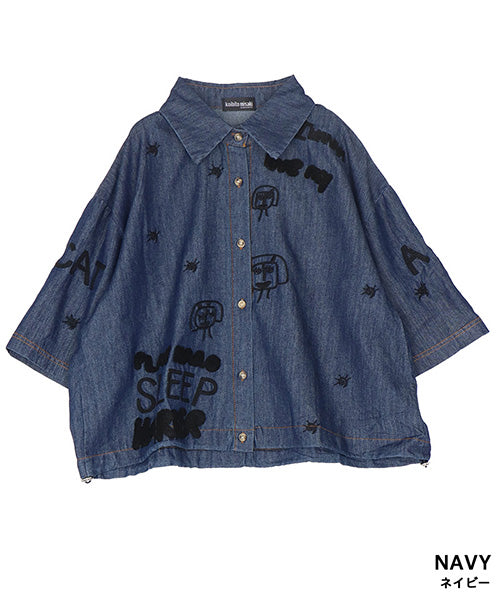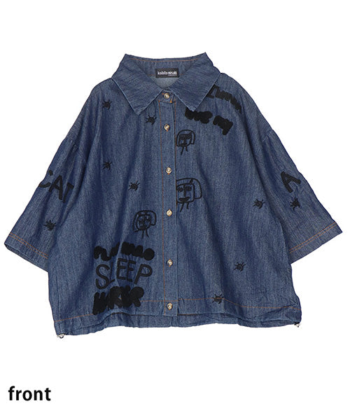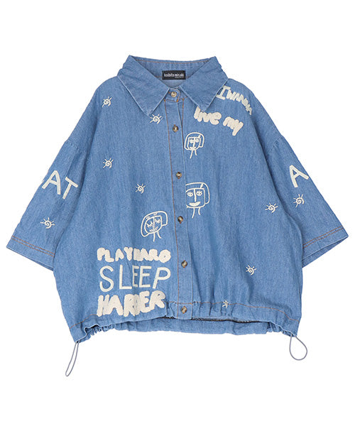 イラストや英字の刺繍が大人可愛いシャツブラウス。ナチュラルな風合いのデニム素材に、立体感のある刺繍をバランスよく配置し、1枚でコーディネートの主役になるデザインに仕上げました。裾に配置したゴムスピンドルでシルエットに変化をつけられます。 身幅広めのワイドシルエットとショート丈でもバランスが取りやすいサイズ感となっています。 生地は適度なハリがありながら軽やかな着心地です。