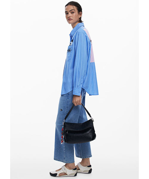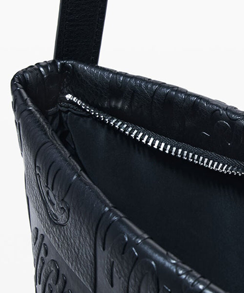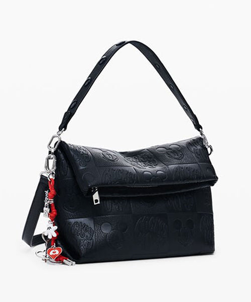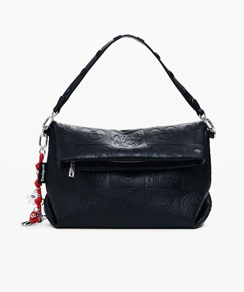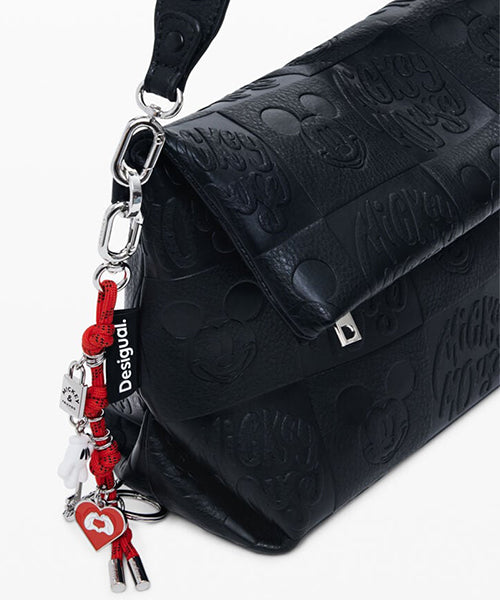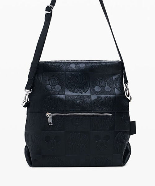 ミッキーマウスのモチーフが入った、3Dエンボス加工のフェイクレザー生地のハンドバッグ。