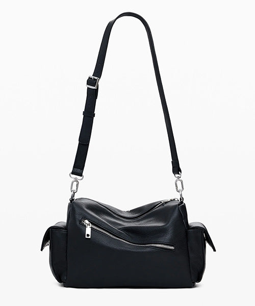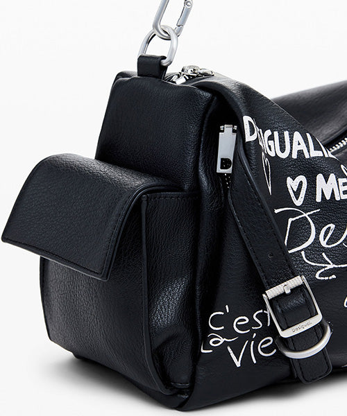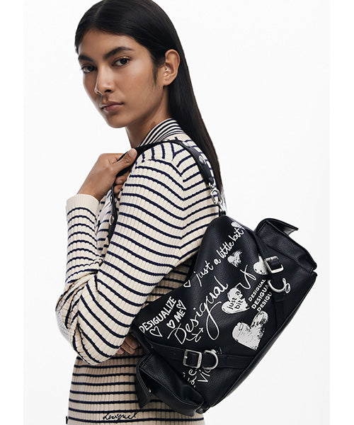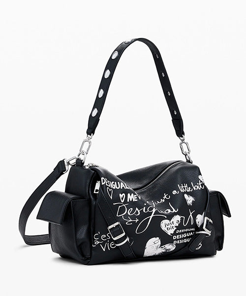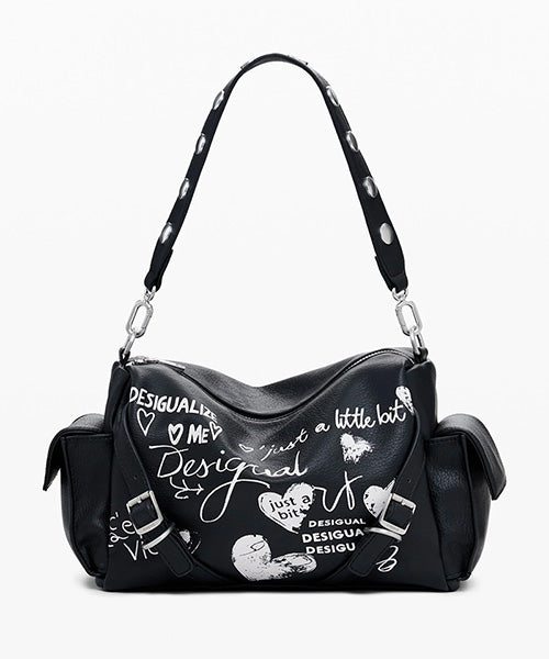 単色のレザー風生地で、中くらいのサイズのボウリングバッグ。 手書きの落書き風プリント付き。