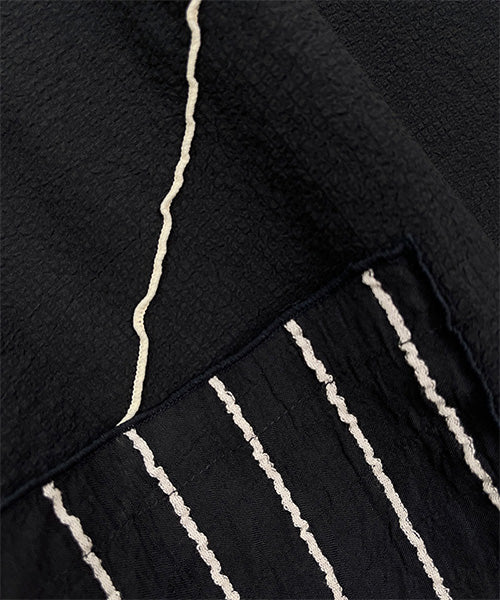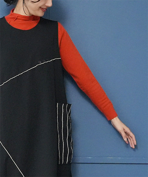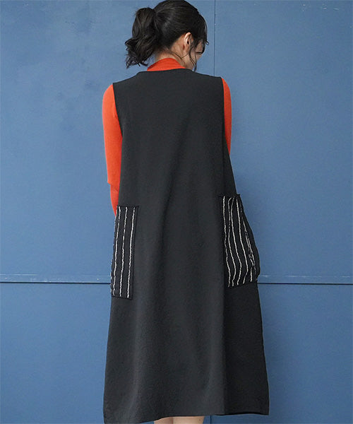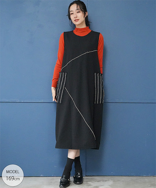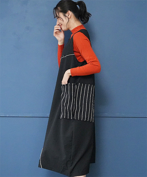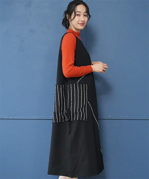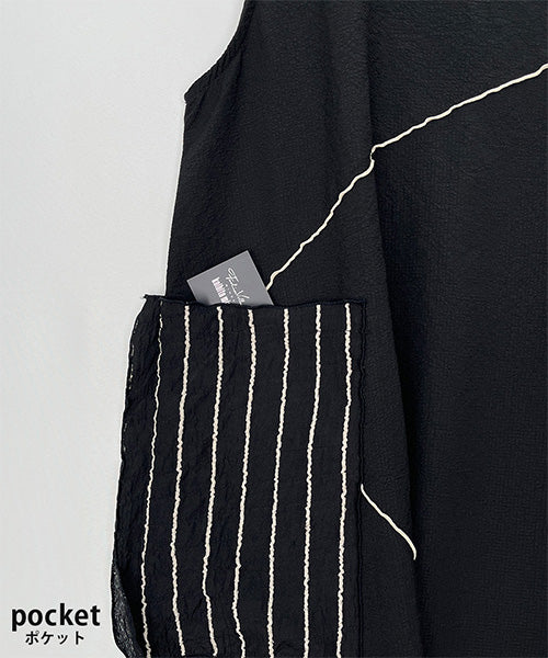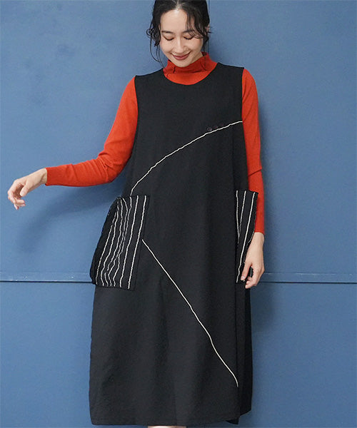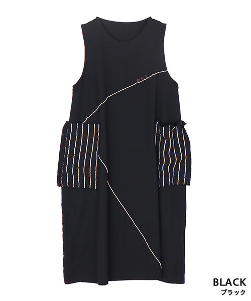 切り替えラインとストライプポケットがアクセントになったノースリーブワンピース。 シンプルなブラックをベースに、異素材のストライプ生地を組み合わせることで立体感とモードな雰囲気を演出します。 ゆったりとしたシルエットで体型を選ばず、快適な着心地です。
